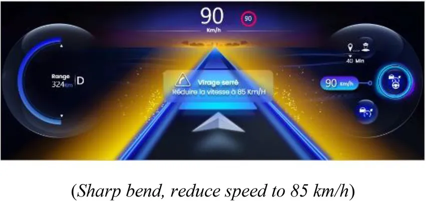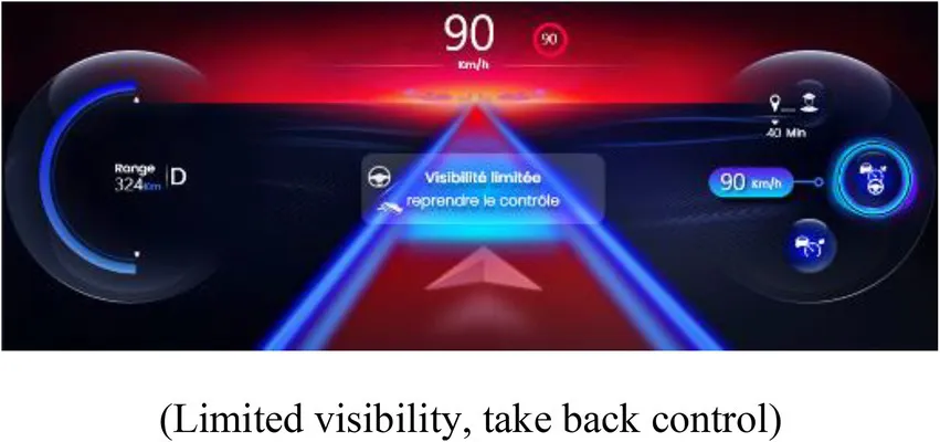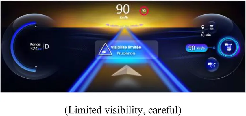 An IPLA was presented in this interface when the PDA was activated. The IPLA informed the drivers about a risk of a transition of the state of the PDA, with the objective of allowing them to anticipate the transition and act appropriately. Its design was based on a prior study and has been improved to reduce the risk of inadequate behavior (Monsaingeon et al., 2021). It was displayed on the instrumentās cluster in order to be perceived in peripheral vision. The limits of the following two systems of the PDA were displayed: limits of LCA and limits of ACC, which also provoked a suspension of LCA. In both representations, a cloud was displayed with varying sizes depending on the proximity to the limits of automation (see Table 1). The following two degrees of limits were indicated: a moderate size and yellow cloud indicated that limits are getting closer but should not be reached, and a large red cloud indicated that limits will soon be reached. A pop-up screen appeared in the center of the instrumentās cluster when the yellow and red clouds were displayed. It represented a visual icon of the event that caused the approach of limits (e.g., representation of a bent road), a textual message of the cause of approach to the limits, and the action to perform to act appropriately.