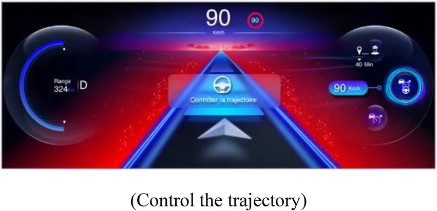Visual representation of the instrumentās cluster of the VBI, with information that was mutual to both interfaces. The driving speed is 90 km/h. The message box on the left gives information on the remaining kilometers on the fuel tank. On the right side, the status of activation of driving automation systems and the set speed are displayed. In the center of the screen, the detected road markings and set distance of the ACC are displayed (blue). Adapted/Reproduced with permission from IRT SystemX.