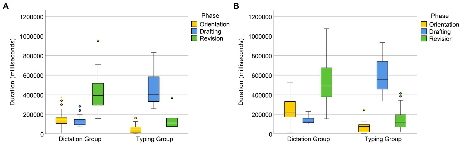 The proportions of the three phases in total task time for the dictation and typing groups are presented in Figure 3. It can be seen that the dictation group spent approximately 60% of their total task time revising after completing their draft using ASR input, while the typing group devoted the majority (72.57%) of their time to the drafting phase.