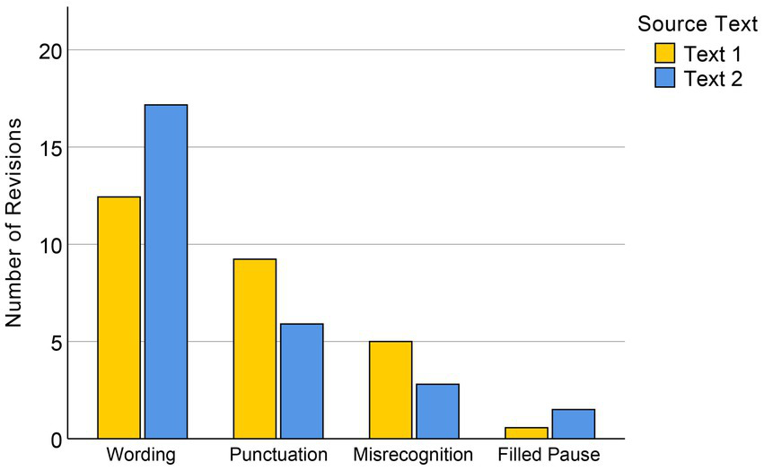 The revision categories of the dictation group were compared across Text 1 and Text 2 (see Figure 4). A paired t-test on the numbers of revised wordings and punctuation marks showed significantly more wording changes in Text 2 (M = 17.17, SD = 5.24) than in the easier Text 1 (M = 12.43, SD = 5.14), t(29) = −5.07, p < 0.001. Conversely, the number of revised punctuations in Text 1 (M = 9.23, SD = 3.34) was significantly larger than in Text 2 (M = 5.90, SD = 2.56), t(29) = 5.04, p < 0.001. We used the Wilcoxon signed-rank test to compare participants’ revisions to misrecognitions between the two texts, as the data showed a non-normal distribution, with a significantly larger number for Text 1 (Mdn = 5) than Text 2 (Mdn = 3), T = 50, Z = −3.64, p < 0.001. The Wilcoxon test on the numbers of deleted filled pauses also showed a significant difference between the two texts, T = 143.5, Z = −2.62, p = 0.009.