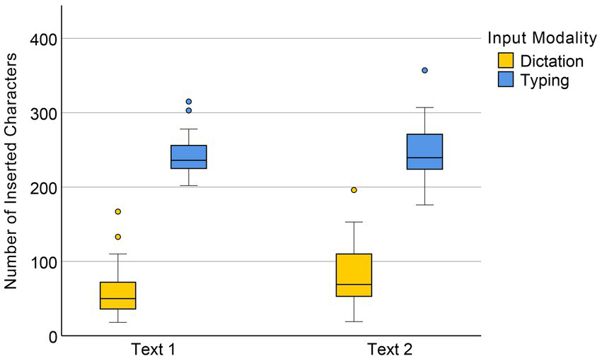 Numbers of inserted characters in dictation and typing conditions.