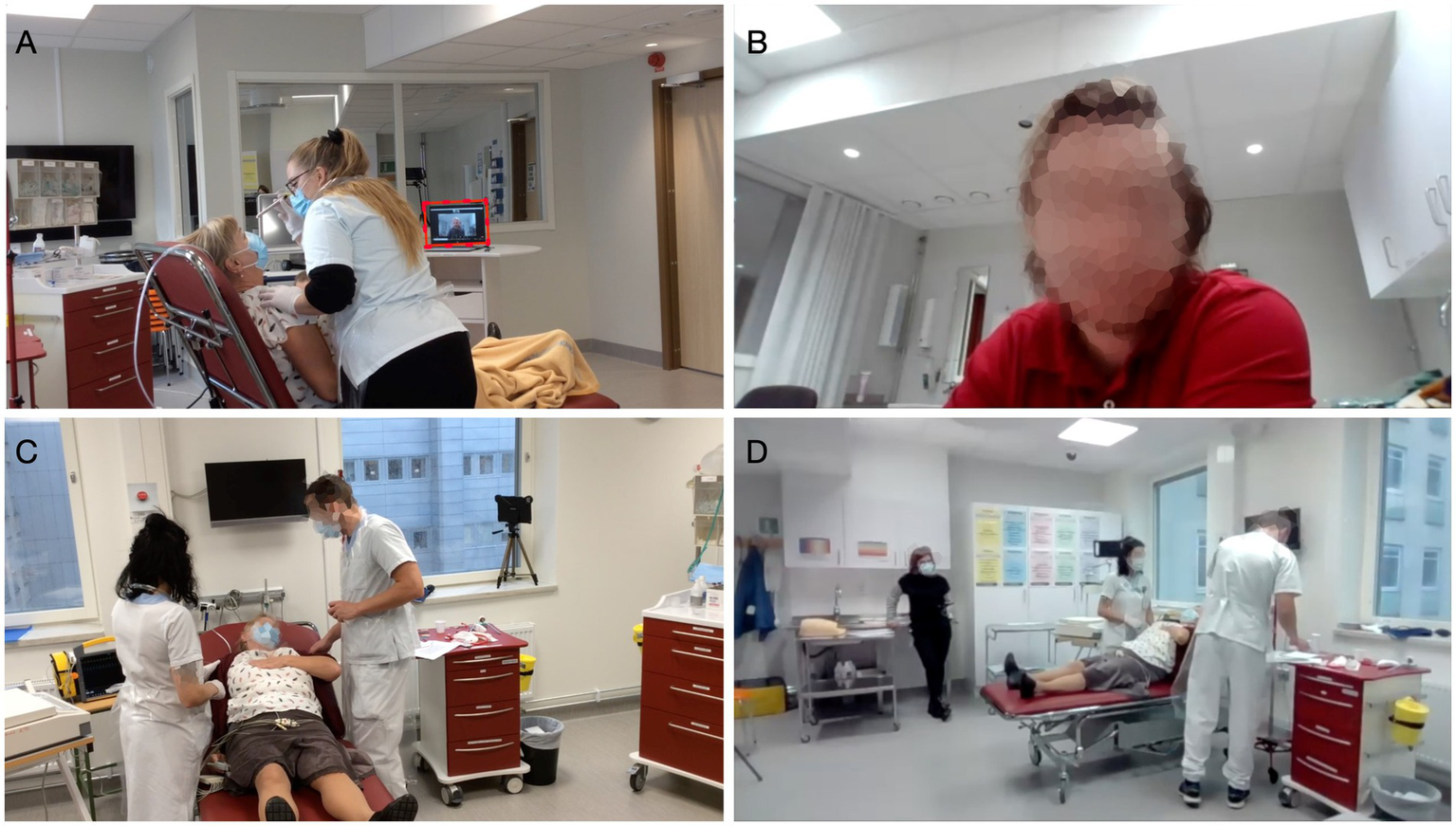 Different camera views. (A) Standardized patient and proximal staff; laptop screen displays the remote physician, encircled in red. (B) Remote physician. (C) Proximal staff and standardized patient. (D) Remote physician’s camera view: facilitator, proximal staff, and standardized patient.