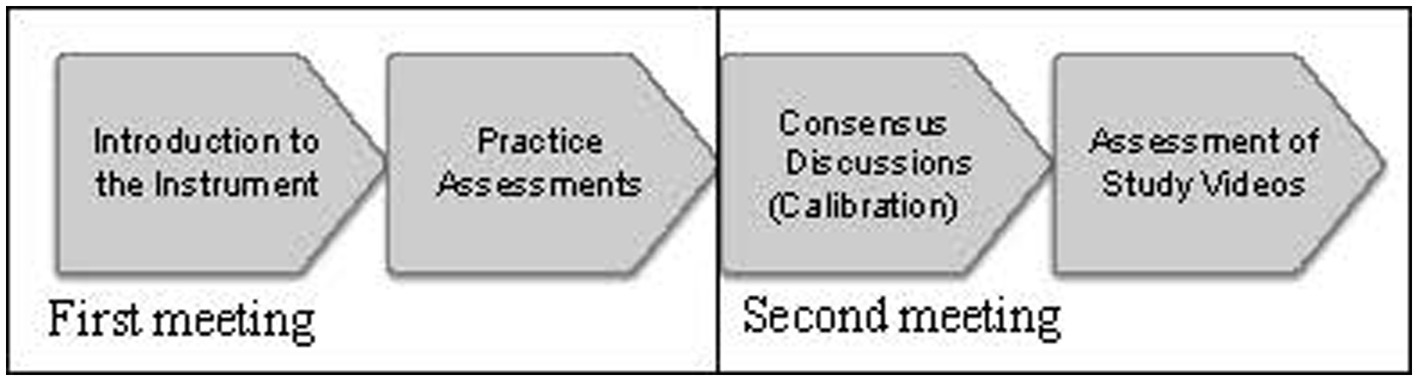 Flowchart for Stage 2: rating procedure. At the first meeting, the instrument was introduced for 2 h. Then, during 2 weeks, the raters assessed two scenarios of 20 min each. In the second meeting, a consensus discussion took place for 2 h. Within 2 months, all raters individually assessed 18 video-recorded simulation-based team training sessions.