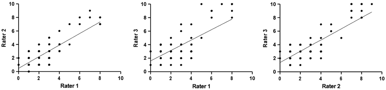 Item rating correlation between the raters, as fitted by linear regression. Rater 1 vs. Rater 2: Y = 0.8572*X + 0.4800, p < 0.0001. Rater 1 vs. Rater 3: Y = 0.7714*X + 1.595, p < 0.0001. Rater 2 vs. Rater 3: Y = 0.8284*X + 1.376, p < 0.0001. The p-value is the significance for the slope being non-zero; i.e., a correlation between x and y.