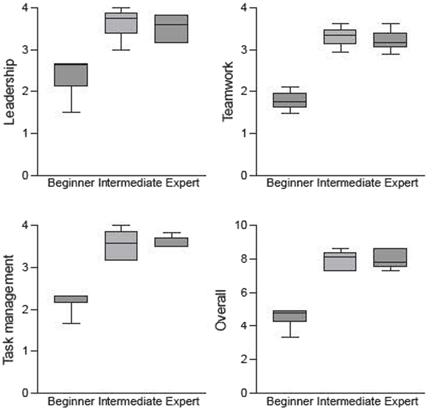 In all three TEAM domains, as well as in the overall performance, significant differences were found between the beginner, intermediate, and expert groups in terms of the performances scores (p < 0.001). The boxplots in Figure 6 illustrate the main differences between the beginners and the other two team categories (intermediates and experts). A comparison of the three TEAM domains for the two scenarios (urosepsis vs. myocardial infarction) showed no significant difference.