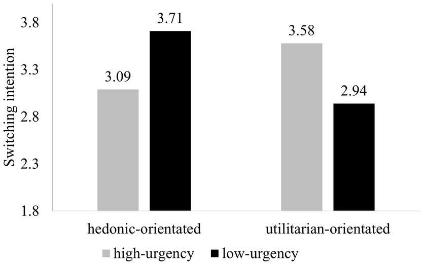To verify H1a and H1b, a two-way ANOVA was conducted with spokes-character urgency and app orientation as the independent variables and switching intention as the dependent variable. The results revealed that the effect of the interaction between spokes-character urgency and app orientation on switching intention was significant [F(1,169) = 9.35, p = 0.003]. As shown in the Figure 1, the data analysis indicated that, for the hedonic-orientated app, the high-urgency spokes-character resulted in a lower switching intention than the low-urgency spokes-character [F(1,81) = 5.03, p = 0. 028; Mhedonic-orientated, high-urgency = 3.21, SD = 0.96; Mhedonic-orientated, low-urgency = 3.72, SD = 1.11]. This result was reversed for the utilitarian-orientated app, as the low-urgency spokes-character resulted in a significantly lower switching intention than the high-urgency one [F(1,88) = 4.38, p = 0.039; Mutilitarian-orientated, low-urgency = 3.12, SD = 1. 05; Mutilitarian-orientated, high-urgency = 3.60, SD = 1.15].