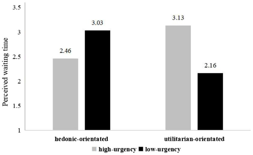 We conducted another two-way ANOVA to test H2a and H2b. This analysis showed that the interaction between spokes-character urgency and app orientation had a significant effect (see Figure 3) on perceived waiting time [F(1,178) = 27.14, p < 0.001]. The results indicated that, for the hedonic-orientated app, the high-urgency (vs. low-urgency) spokes-character caused participants to report a shorter perceived waiting time than the low-urgency spokes-character [F(1,83) = 7.58, p = 0. 007; Mhedonic-orientated, high-urgency = 2.46, SD = 0.88; Mhedonic-orientated, low-urgency = 3.03, SD = 1.02]. But for the utilitarian-orientated app, the low-urgency spokes-character induced a shorter perception of the waiting time than the high-urgency spokes-character [F(1,95) = 21.57, p < 0. 001; Mutilitarian-orientated, low-urgency = 2.16, SD = 0.86; Mutilitarian-orientated, high-urgency = 3.13, SD = 1.19].