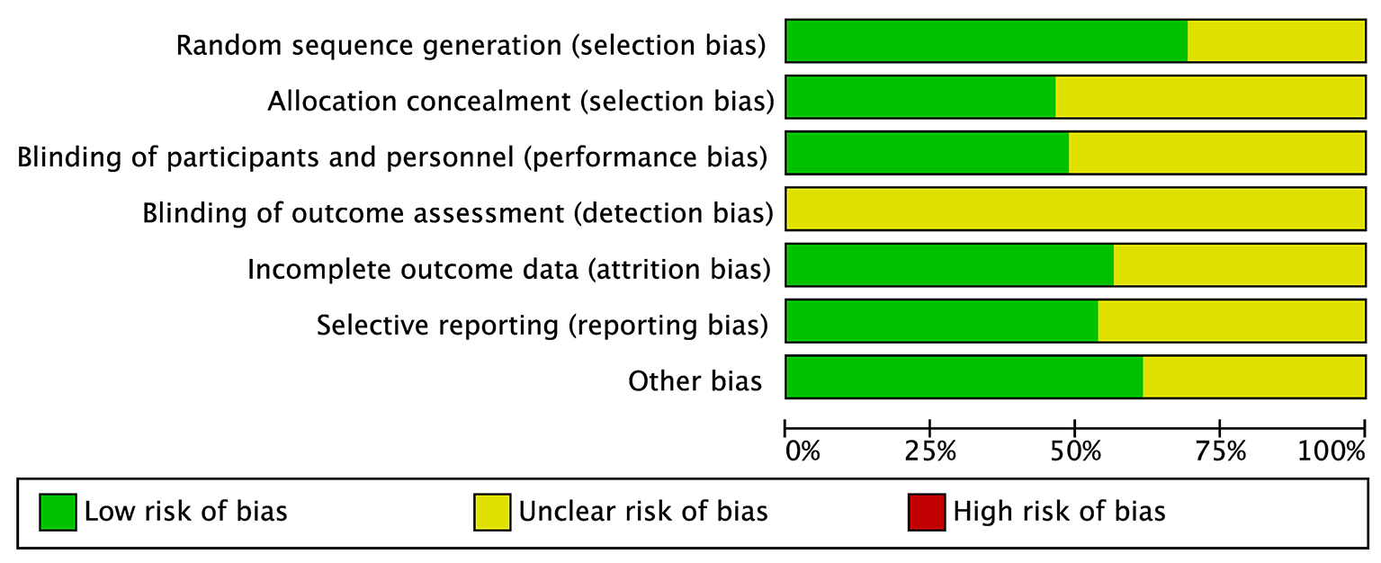 The risk of bias was independently assessed according to the Cochrane Handbook 5.1.0 Methodological Quality Evaluation Criteria (Higgins et al., 2011) by two researchers. The relevant indicators in this assessment were divided into random sequence method, allocation concealment, blinding by researchers and subjects, selective reporting, completeness of outcome data, and other biases. Different colors (green, red, and yellow) represented the judgment of “low-risk bias”, “high-risk bias”, and “unclear”. Every disagreement was discussed and finally was decided by the third researcher.