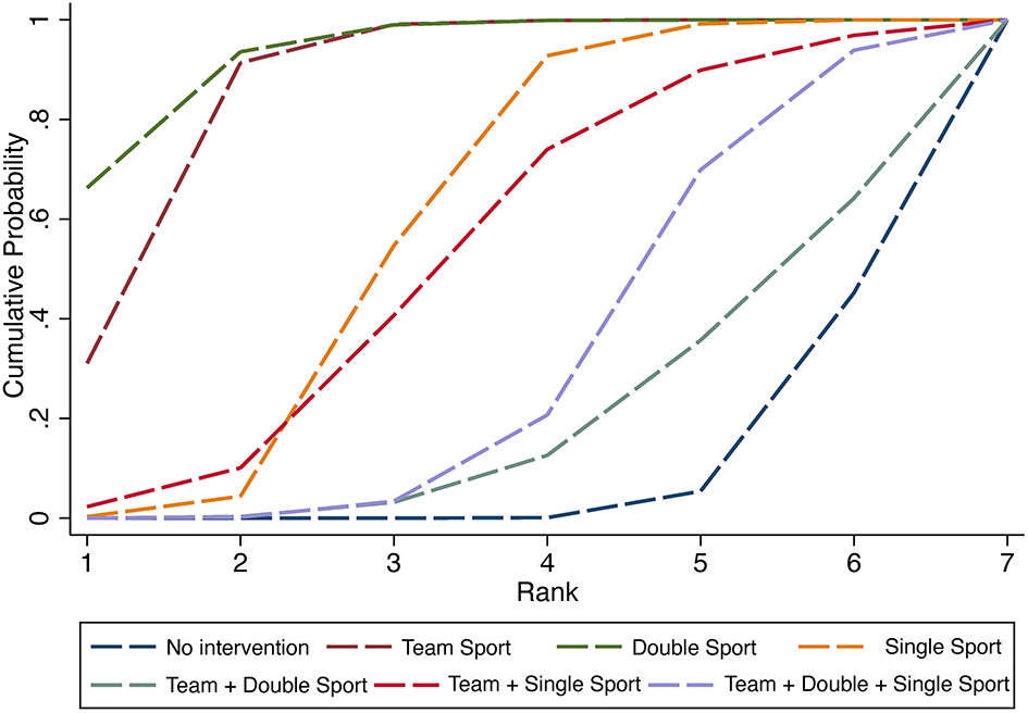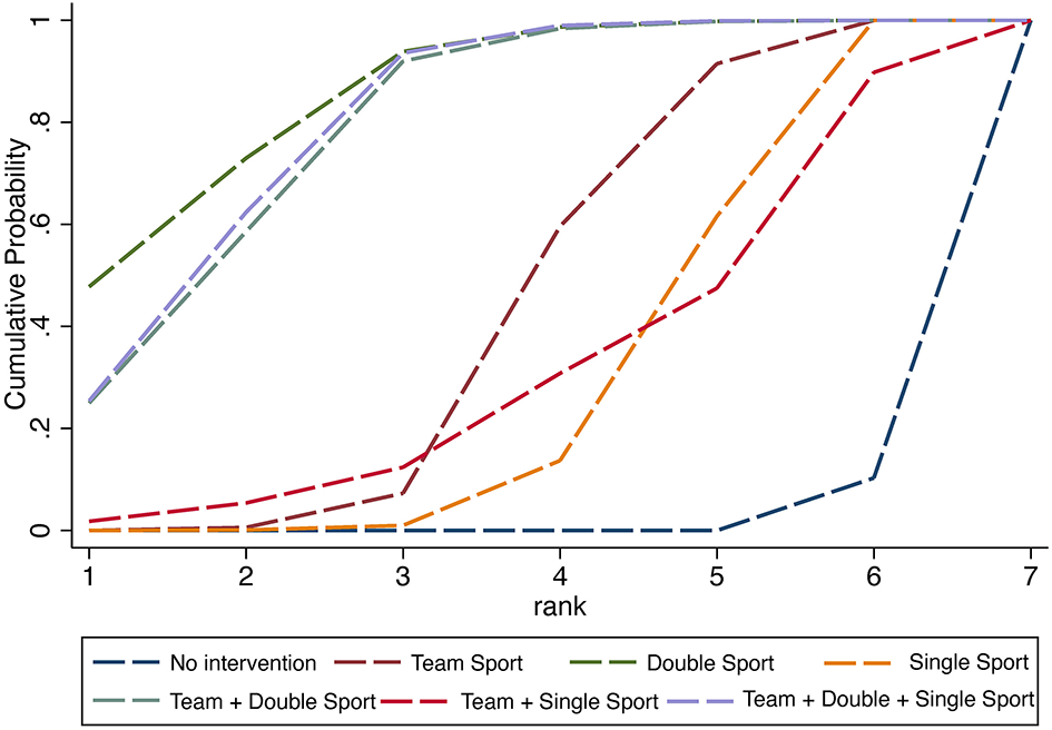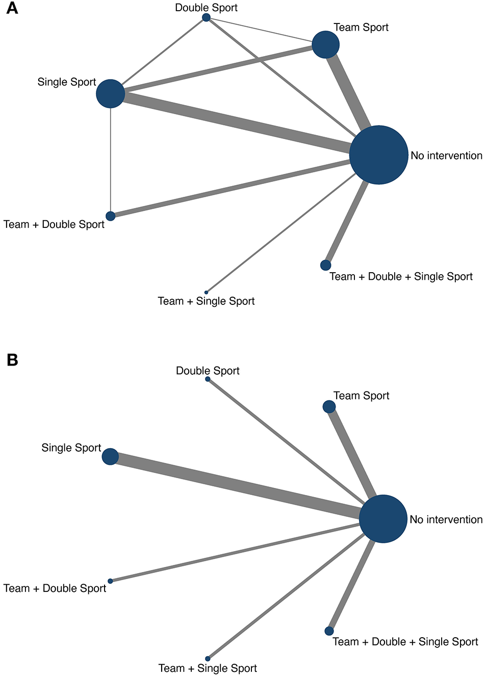 Accordingly, the goals of this network meta-analysis were to (1) quantitatively compare the effect of different exercise types for Internet-addicted students by comprehensively considering the improvement of IA and mental health; and (2) screen out the most suitable intervention project for IA students by the comprehensive evaluation and ranking of the effects of different sports types. Specifically, we hypothesized that (1) the exercise intervention would have positive effects on loneliness (H1a), anxiety (H1b), depression (H1c), and interpersonal sensitivity (H1d) on IA students; (2) the double sport with some interaction would have the best intervention effects for Internet addiction (H2a) and mental health (H2b); and (3) the double sport would be the optimal exercise type under the combined consideration of IA and mental health (H3).