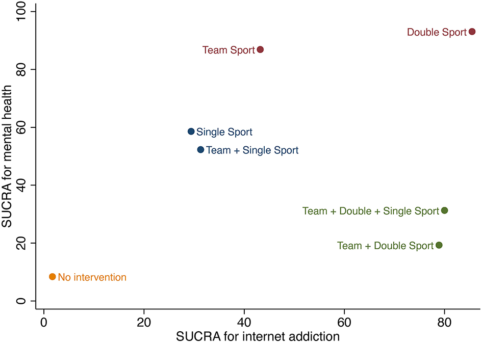 Network meta-analysis (NMA) is considered a useful method to compare more than two interventions (Lumley, 2002; Jansen and Naci, 2013; Li L. et al., 2014). Meanwhile, NMA allows the use of indirect comparison methods to quantitatively compare different interventions for the treatment of similar conditions and thus select the best treatment regimen (Bucher et al., 1997; Tian et al., 2013). We used NMA to investigate the differential effects of different exercise types on IA students. Moreover, mental health is a key factor in IA (Ko et al., 2012; Babadi-Akashe et al., 2014). IA students scored higher on their loneliness, anxiety, depression, and interpersonal sensitivity than healthy controls on subjective (Long et al., 2021; Zhang et al., 2021; Qiu et al., 2022; Yang et al., 2022). Thus, treatment should not only focus on whether the level of IA is decreased but also on the improvement of mental health indicators related to IA (Li et al., 2017; Zhang et al., 2018). We integrated the effects of interventions on IA and mental health and explore the utility of the interventions and relevant intervention mechanisms. We used the two-dimensional clustered ranking map of NMA to comprehensively rank the effects of different exercise types and identified the best treatment for IA students.