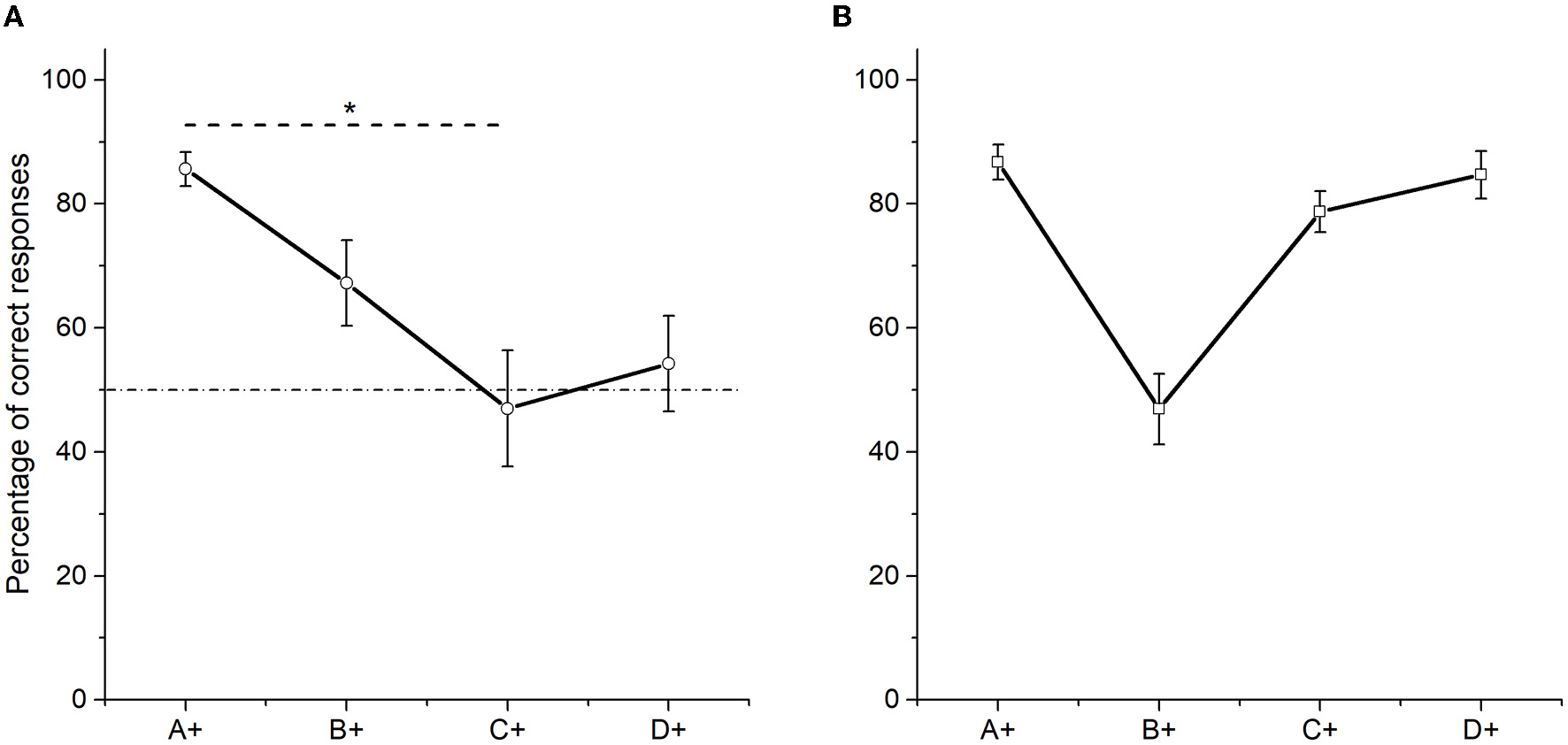 Figure 1A shows the average percentage of correct responses in the latest two sessions of training. Each square represents the average percentage of correct responses in the pair where the stimulus + was reinforced with a probability of 0.7. After training, only in the pair C + D−, the amount of correct responses was under chance level (W= 22, p = 0.006).