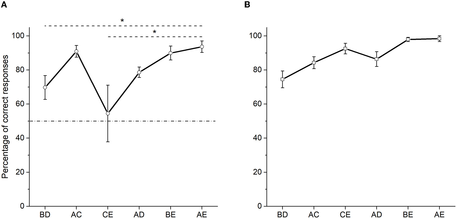 Tests (i.e., B) comprised 200 trials of non-adjacent pairs BD, AC, AD, CE, BE, and AE, presented in random order and under non-differential reinforcement (p = 0.5 for all stimuli). The first test lasted for four sessions.