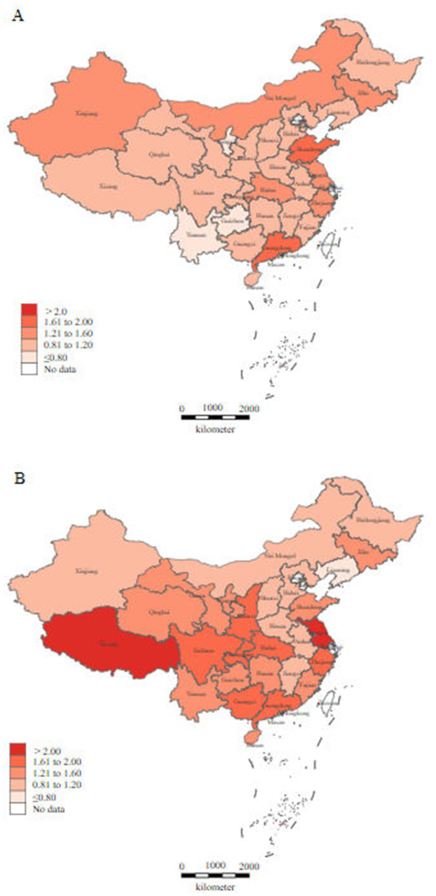 Geographical distribution of rural PMS density in 2010 (A) and 2020 (B). The data were collected from China Health Statistical Yearbook 2011 and China Health Statistical Yearbook 2021.