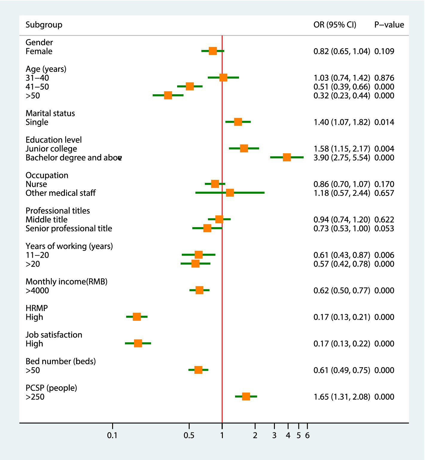 Figure 4 shows the results of the univariate analyses for PMS turnover intention based on individual- and institution-level indicators. Among the individual-level indicators, single and higher education levels were positively associated with turnover intention (p < 0.05 for all) and aged 41–50 years old and over 50 years, working time of more than 10 years, monthly income of more than 4,000 yuan, high HRMP level, and high job satisfactionwere negativelyassociated with turnover intention (p < 0.05 for all). Regarding the institutional-level indicators, the odds of turnover intention was significantly higher in PMS working at institutions with PCSP more than 250 people (OR: 1.65, 95%CI: 1.31–2.08, p < 0.001) than in those working at institutions with 250 people or less. In contrast, the odds of turnover intention was significantly lower in PMS working at institutions with more than 50 beds (OR: 0.61, 95%CI: 0.49–0.75, p < 0.001) than in those working at institutions with 50 beds or less.