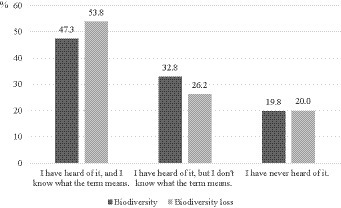 Self-reported knowledge of participants from questionnaires on biodiversity (n = 131) and biodiversity loss (n = 130) for the term “biodiversity.” Question asked following the Nature Awareness Study 2019 published by the Federal Ministry for the Environment, Nature Conservation, Nuclear Safety and Consumer Protection (BMU) and Federal Agency for Nature Conservation (BfN) (2019). Frequencies are presented as percentages.