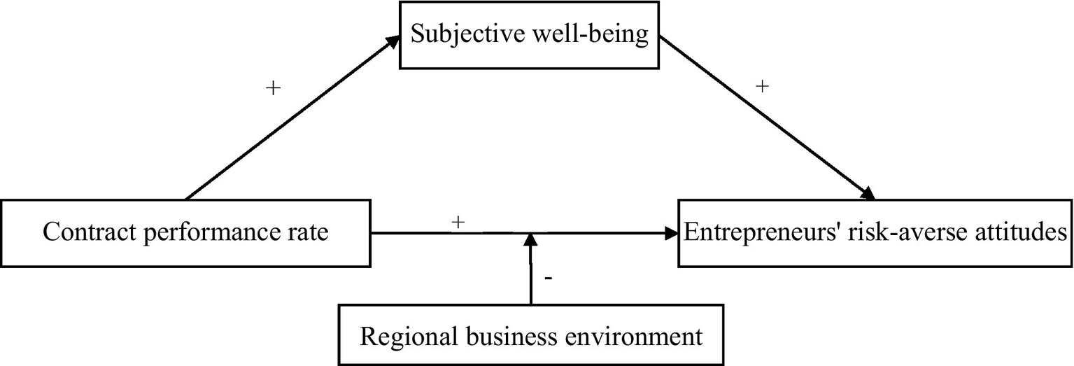 Figure 1 presents the hypothesized relationships bet ween the key variables discussed in this paper. The conceptual framework shows both a direct and indirect influence between contract performance rates and entrepreneurs’ risk-averse attitudes through the mediating role of subjective well-being and the moderating role of the regional business environment.