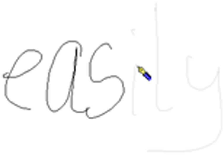 Handwriting example B from a child for the word easily. Note for Figure 1 and this figure: In Figure 1, the pen icon indicates the final moment where the pen was in contact with the page during the production of the letter “s.” The green line indicates where the pen travels to. In this figure the pen icon indicates the first contact the pen has with the page for production of the letter “i.” The time between the final contact of pen on paper for the letter “s” and the first contact for the letter “i” is the morphological boundary. In this case, there is a single pause of 92 ms at the morphological boundary.
