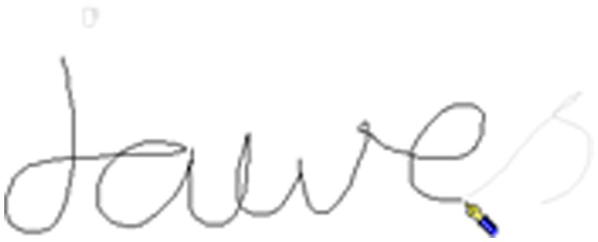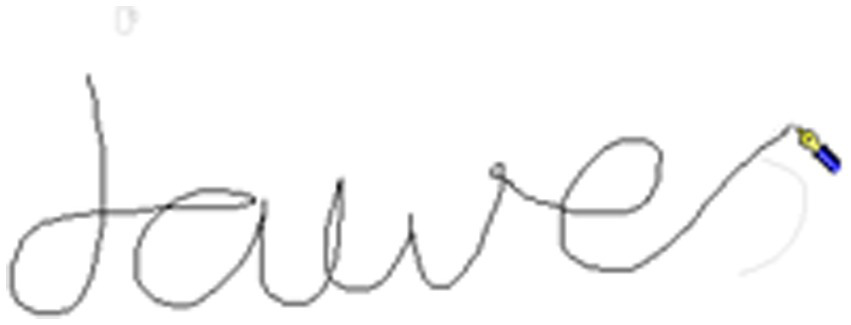 When the letters either side of the boundary were joined (in cursive script) the boundary included linking strokes. For example, Figures 3, 4 shows the word jaws, written as jawes with the morphological boundary between the “e” and the “s” (jawe-s), with the “e” and “s” joined. As illustrated by Figure 3, the stroke joining the letters either side of the morphological boundary starts at the change of pen trajectory at the end of the “e” and ends at the change in pen trajectory at the start of the “s” (end of stroke shown in Figure 4).