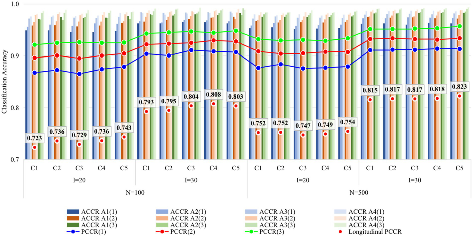 Also, the attribute correct classification rate (ACCR) and pattern correct classification rate (PCCR) were computed to evaluate the classification accuracy of attributes as and , where I(·) was an indicator function, αnkr and was the true and estimated status of person n for attribute k on occasion r, respectively; αnr and was the true and estimated attribute profile of person n on occasion r, respectively; N was the sample size, and Re was the number of replications. Following Zhan et al. (2019a), two kinds of PCCR were considered: PCCR on each occasion and longitudinal PCCR (LPCCR) for all occasions. The former focuses on whether K = 4 attributes on a given occasion can be correctly estimated, while the latter focuses on whether all T × K = 12 attributes can be correctly estimated.