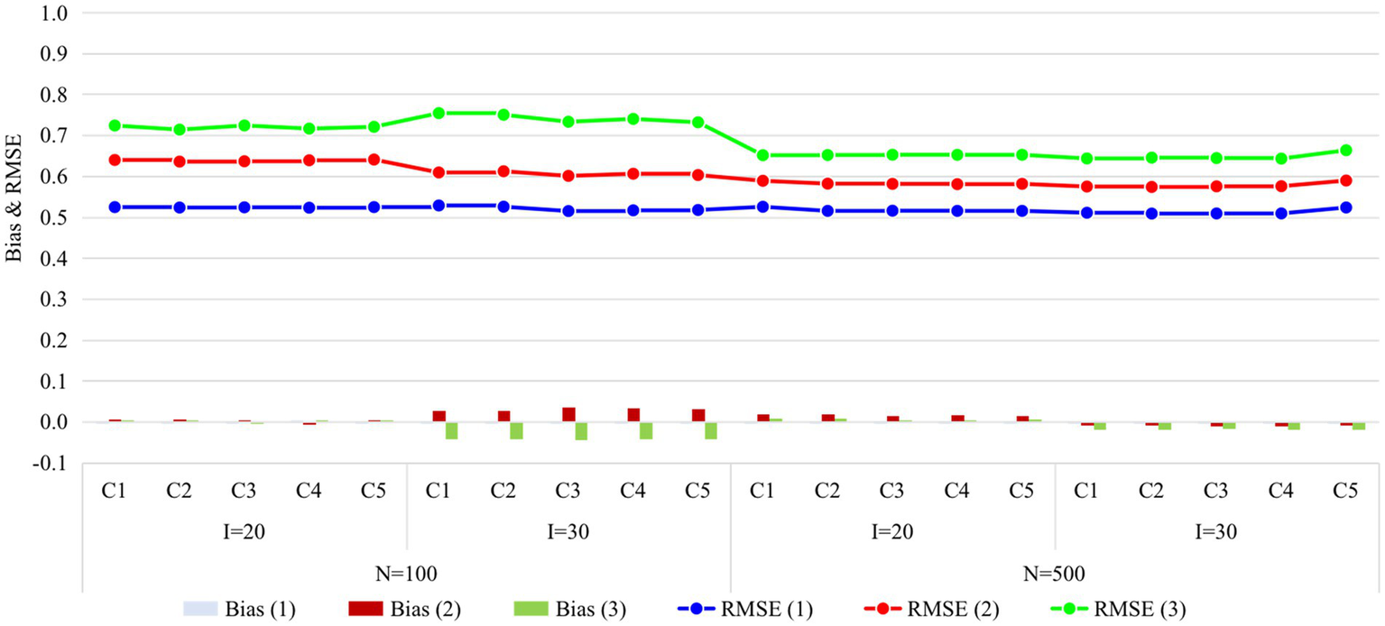 Recovery of ability in Study 1. I, number of items; N, sample size; Occasion is in parentheses; C1, four items outside R were set as anchor items; C2, four items inside R were set as anchor items; C3, eight items outside R were set as anchor items; C4, four items inside and four items outside R were set as anchor items; C5, eight items inside two Rs were set as anchor items; R, unit Q-matrix; RMSE, root mean square error.