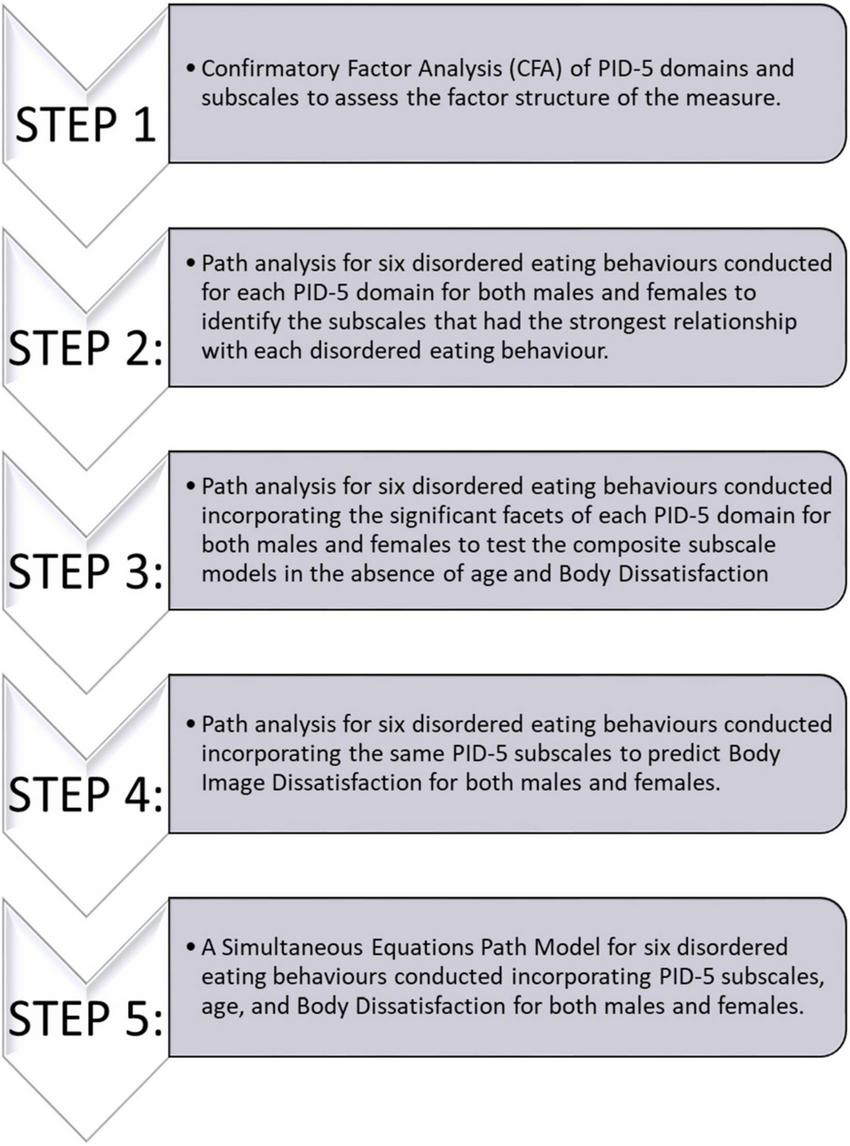 The statistical procedure used in the current study has been outlined in Figure 2. Two participants had missed items throughout the study and were excluded from the path analyses. First, a Confirmatory Factor Analysis (CFA) was performed to verify the relationship between observed variables and underlying latent trait domains explored in the PID-5, and to ensure that the latent structure of the PIDF-5 existed within our data (see Supplementary material). Then a theoretical path model for the facets within each PID-5 trait domain explored how the facets within a domain were associated with eating behaviour. A less stringent alpha value was implemented (p < 0.1) to account for potential suppressor effects of other scales within the same domain for steps two and three. In order to allow for continuity of analysis across genders, the sexual orientation was excluded as a control variable due to the large difference in proportions between females and males who did not identify as heterosexual. A sensitivity analysis was performed, where models including sexual orientation as a control were compared to those without, confirmed this decision as very few differences were found between the models.