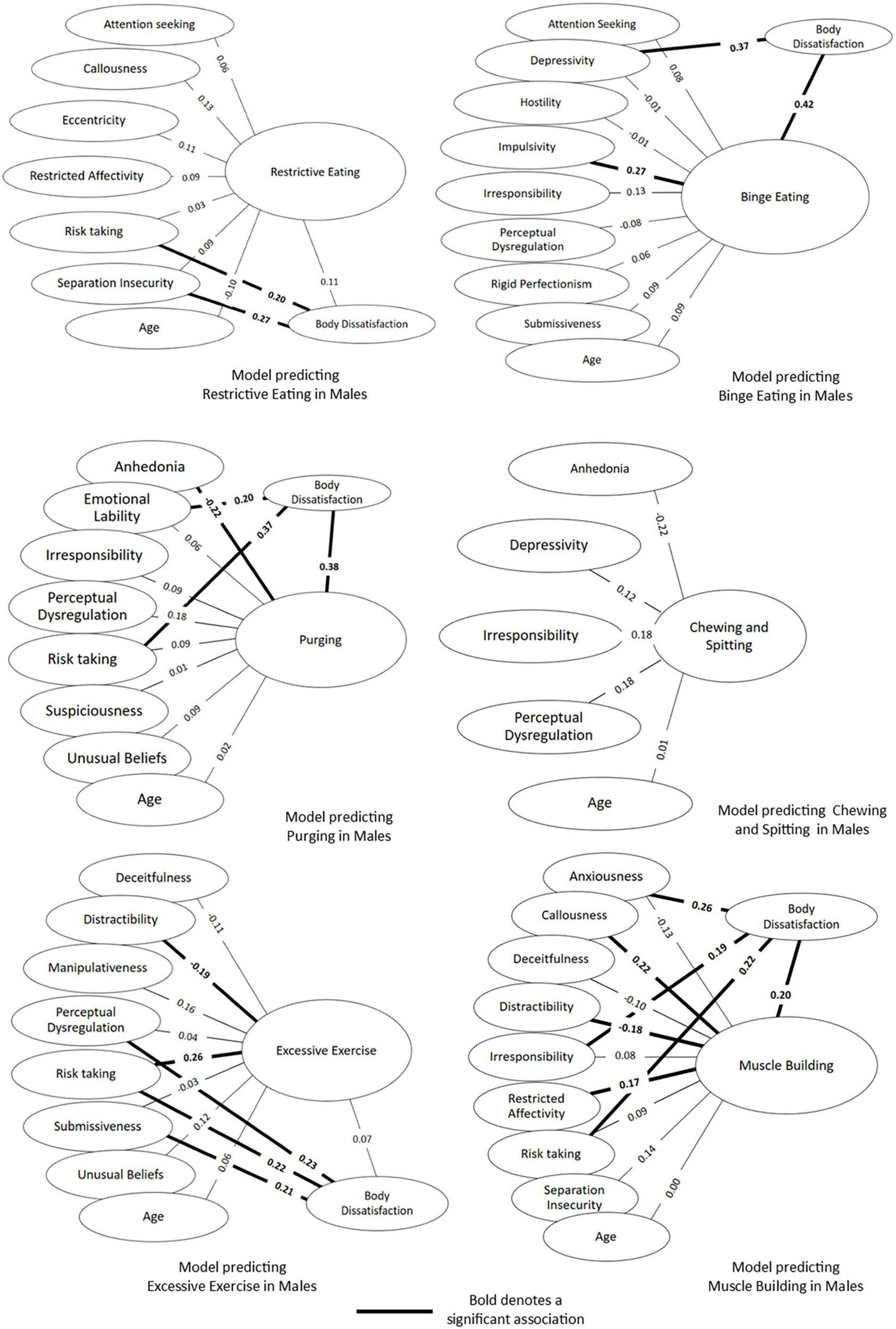 Studies exploring gender differences in disordered eating behaviour have suggested that disordered eating has been increasing at a faster rate among males compared to females (Gorrell and Murray, 2019). Although females tend to restrict their diet or purge more frequently than males, males tend to be equally as likely to binge eat (Mitchison et al., 2014), and may engage in behaviours intended to achieve a muscular physique (Gorrell and Murray, 2019). Gender differences have been identified in the relationship between normative personality and disordered eating, in that different personality traits have been found to be associated with the same disordered eating behaviour (Gilmartin et al., 2022). However, within the limited research literature exploring disordered eating and the PID-5, no differences have thus far been identified (Solomon-Krakus et al., 2019). Therefore, we examined the relationship between personality and disordered eating separately between males and females so that we could explore the relationships unique to males and females. We also used a measure of disordered eating that has been designed to detect disordered eating behaviours that may be more relevant for males such as exercise and building muscle (Forbush et al., 2014) in addition to restrictive eating, binge eating, purging and chewing and spitting.