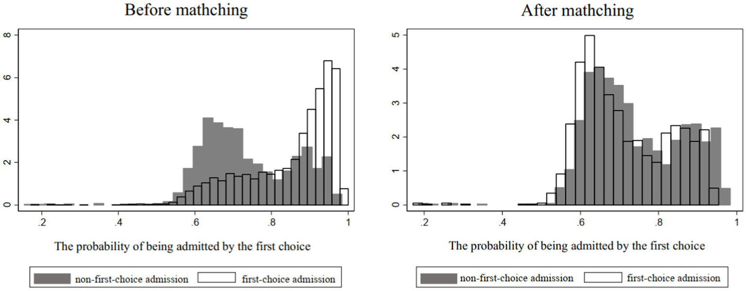 The innovation of this study is as follows. First, in terms of the measure of the independent variable, as former studies only take professional preferences into consideration when analyzing the admitted characteristics of college entrance examinations, the paper constructs a more comprehensive index to measure the admitted characteristics of college entrance examinations, including the first choices of colleges, independent selection of majors, and college admission routes. Second, in terms of measures of dependent variables, while overall satisfaction is generally used as the dependent variable in former studies, the paper expands the measurement of students’ college satisfaction, which is divided into academic satisfaction and nonacademic satisfaction. The former refers to satisfaction related to teaching, scientific research and courses, and the latter refers to interpersonal relationships. Third, in terms of research methods, there are endogeneity problems in former studies, and the accuracy of empirical estimation needs further improvement. Accordingly, the propensity score matching (PSM) method is adopted partly to solve endogeneity problems and obtain more accurate estimates. Fourth, in terms of heterogeneity analysis, whereas previous studies mainly focus on differences among students in different grades, the paper further explores the heterogeneity in student groups of different types of colleges.