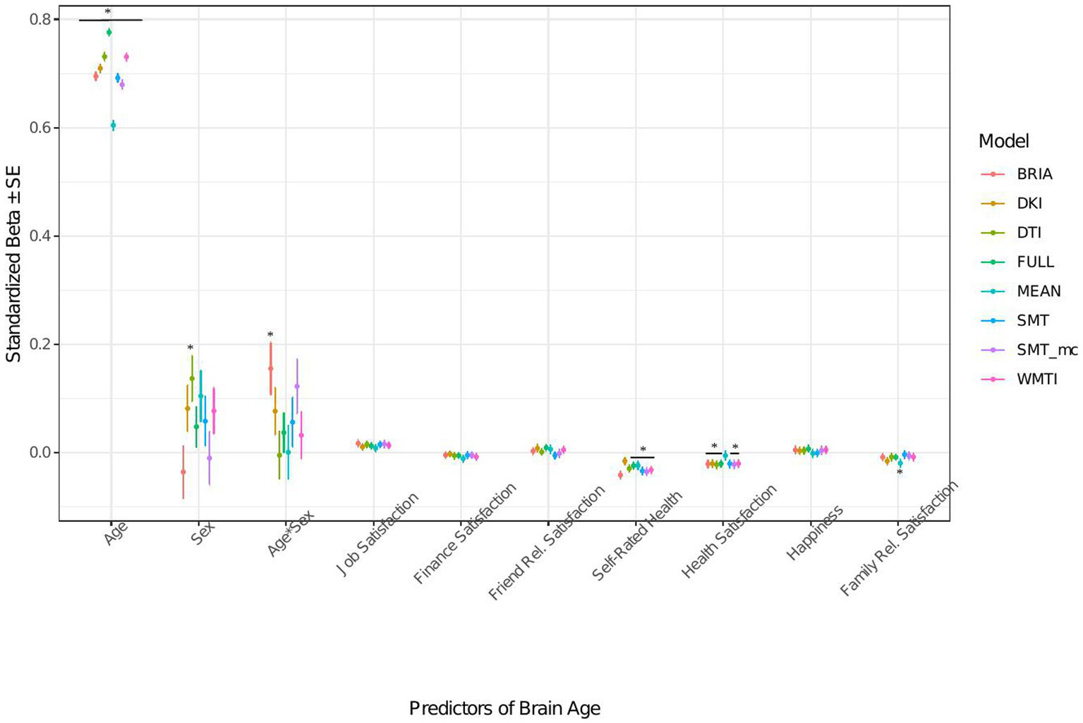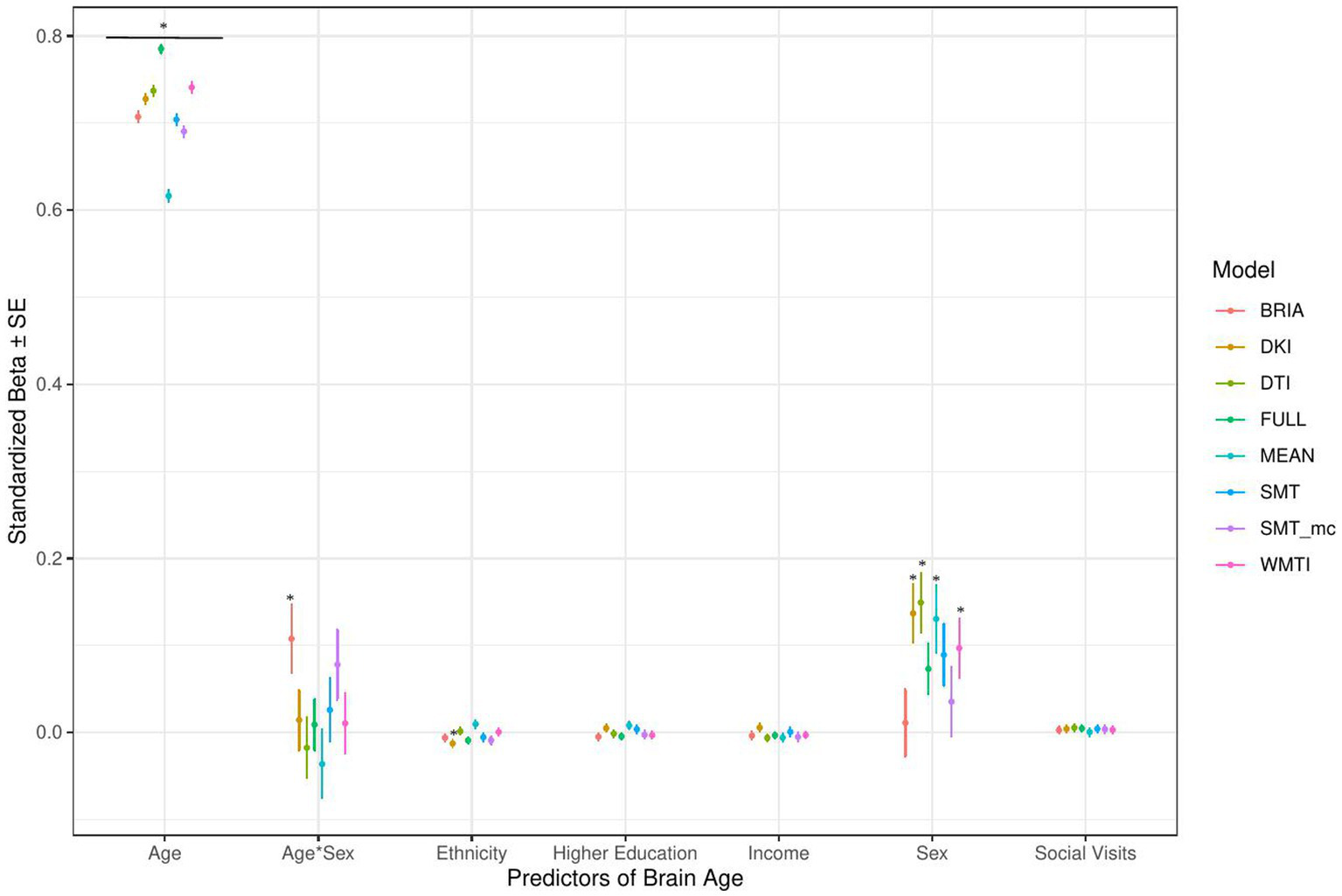 In the model including sociodemographic factors explaining brain age (see Figure 4 for the predictors), results were mixed for the significant predictors. Sex was a significant predictor for mean DKI, DTI, and WMTI (ps < 0.05), the age-by-sex interaction only for BRIA (p = 0.045), and ethnicity only for DKI (p = 0.012; Figure 4). Overall, only 95% confidence intervals of β-values for age and ethnicity were not consistently overlapping, indicating differential effects of these variables on brain age based on the underlying data. All other 95% confidence intervals surrounding coefficients’ β-values were overlapping across diffusion approaches, with expected strong age contributions predicting brain age.
