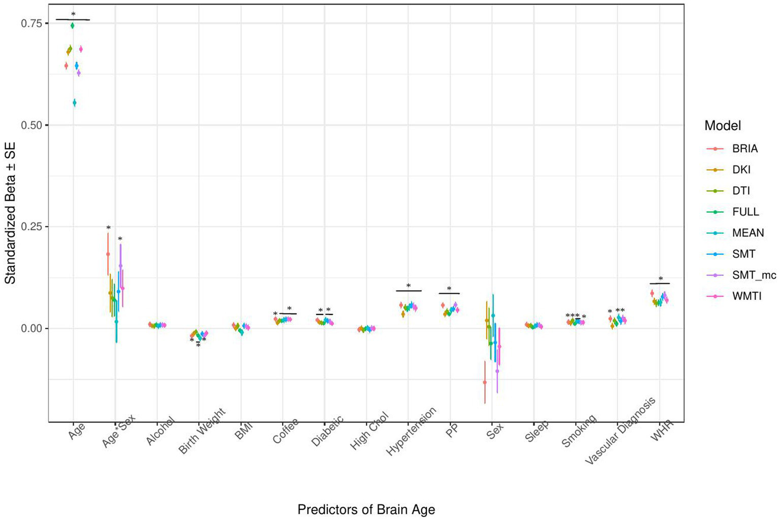 Similarly, in the model including health and lifestyle factors explaining brain age (see Figure 5 for the predictors), significant health factors leading to higher brain age were WHR (ps < 0.001), pulse pressure (ps < 0.001), and hypertension (ps < 0.001). Evidence across diffusion approaches was mixed for the other predictors with smoking predicting brain age derived from BRIA, DTI, mean scores, SNT, and WMTI (ps < 0.05), diabetes diagnosis for all models except DKI and DTI (ps < 0.05), the diagnosis of at least one vascular disease for BRIA, mean scores, and mcSMT (ps < 0.02), and average daily cups of coffee for brain age estimates except the one based on BRIA (ps < 0.01), and the age-by-sex interaction for BRIA and mcSMT (ps < 0.04).