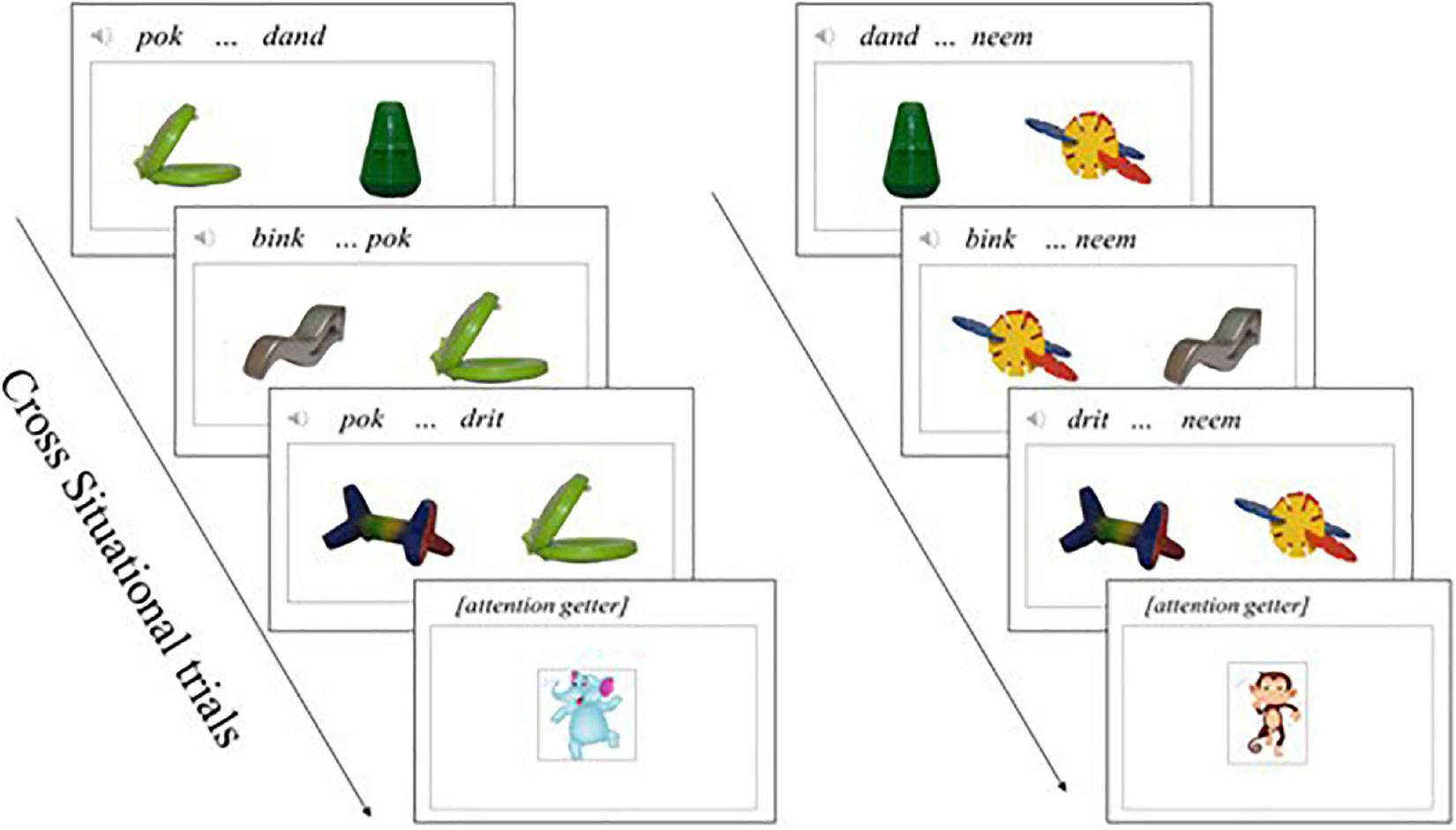 Vocabulary proficiency in preschool children (i.e., 4–6 year-olds) is a strong predictor of school outcomes (Whitehurst and Lonigan, 1998; Uccelli and Páez, 2007; Asaridou et al., 2017), and school success is, in turn, an indicator of positive achievement and earnings later in life (Karoly et al., 2006). A child’s vocabulary depends greatly on their ability to learn new words (Carey and Bartlett, 1978; Sénéchal et al., 1995) and to retain them for later use (Samuelson and McMurray, 2017). Successful word learning implies overcoming different degrees of word ambiguity across contexts (Beck et al., 1983; Hirsh-Pasek et al., 2004; Yu and Smith, 2007). The way children overcome this challenge may depend on the word-learning scenario or condition they are presented with (Samuelson and McMurray, 2017; Byers-Heinlein, 2018), but also on children’s developmental stage (Golinkoff et al., 1994; Hirsh-Pasek et al., 2004) and maturation of their domain-general cognitive processes (Samuelson and Smith, 1998; Vlach and DeBrock, 2017).