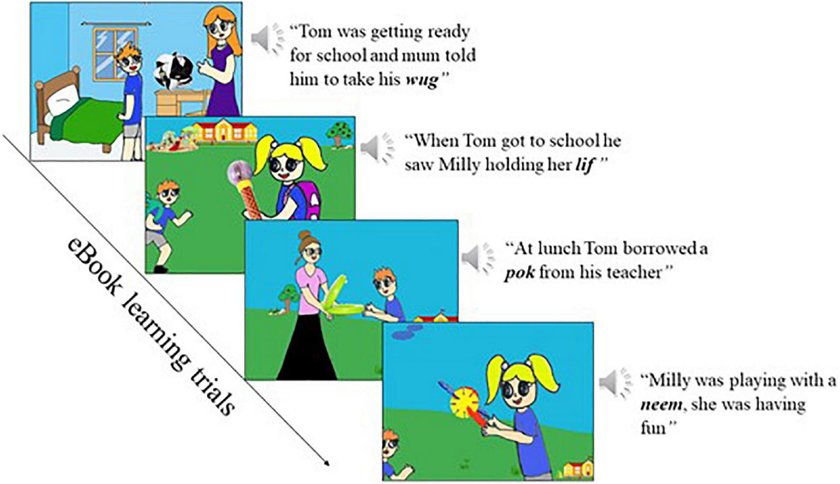 The stimuli consisted of a story presented in an audio-visual eBook format, inspired and adapted from Escudero et al. (under review), Ramachandra et al. (2011). The story was titled “Sharing at School” and consisted of 14 cartoon slides with a pre-recorded audio narrative and visuals. Twelve slides contained the target novel words, while the initial slide was the title page and the last slide was the closing page. The four novel-target words and their visual referents (i.e., novel objects, see section “Target novel words and objects stimuli”) were couched in the story-plot among familiar English words and familiar images depicting a scene. The audio narrative in each cartoon slide lasted 6,000 ms. Then, a red arrow appeared on the inferior-right-hand side of the screen for 3,000 ms while the visual stimuli remained, and the child had the option to touch the arrow to move to the next slide. This red arrow was added in the paradigm to encourage children’s active participation in the story, but this was not a requirement for the task and no data was collected regarding the number of participants that touched the arrow to turn the page. However, observably this option to click to go to the next page of the eBook was hardly used by children because the eBook advanced automatically after the 3,000 ms. During the whole story, children had a total of three exposures to each target novel word and their correspondent object. During the learning phase, the participants listened to the story twice, such that by the end of the eBook learning phase, they were exposed to each novel word-object pair six times. All participants were exposed to all trials in the same fixed order. Figure 4 below illustrates a sample of the eBook pages. Please see the complete eBook story “Sharing at School” with words order list in Supplementary Table 3.
