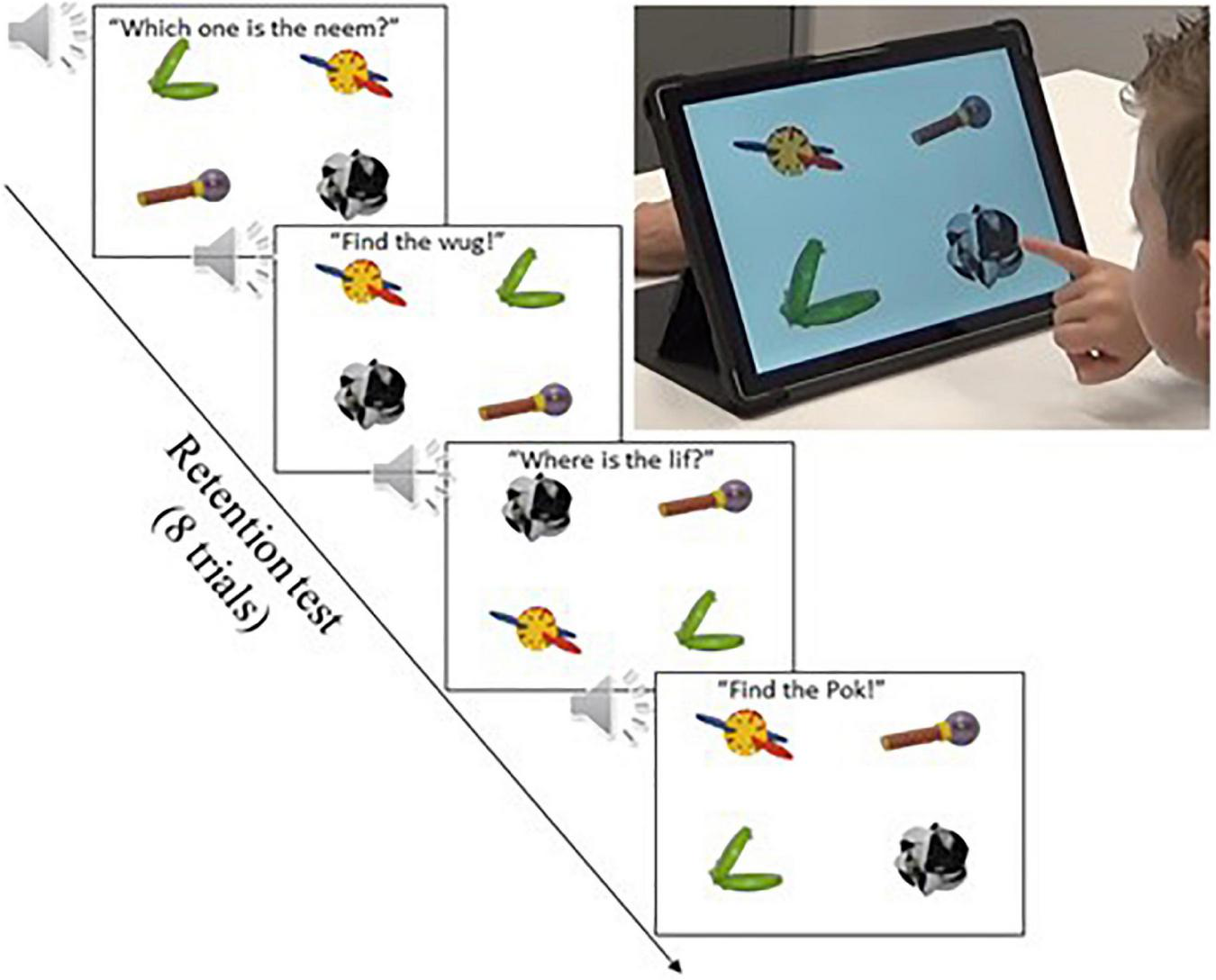 Prior to the immediate retention test, children participating in the CSWL and eBook conditions were exposed to three familiarization trials to get used to the touchscreen test format and its response method. Each familiarization trial consisted of four pictures in which participants were asked to identify one of four familiar objects (i.e., Where is the cat? Find the banana! Touch the book!). The child responded by pressing the corresponding picture on the screen. Children participating in the mutual exclusivity condition were exposed to similar familiarization trials before the learning stage, so this phase was not included for this group.