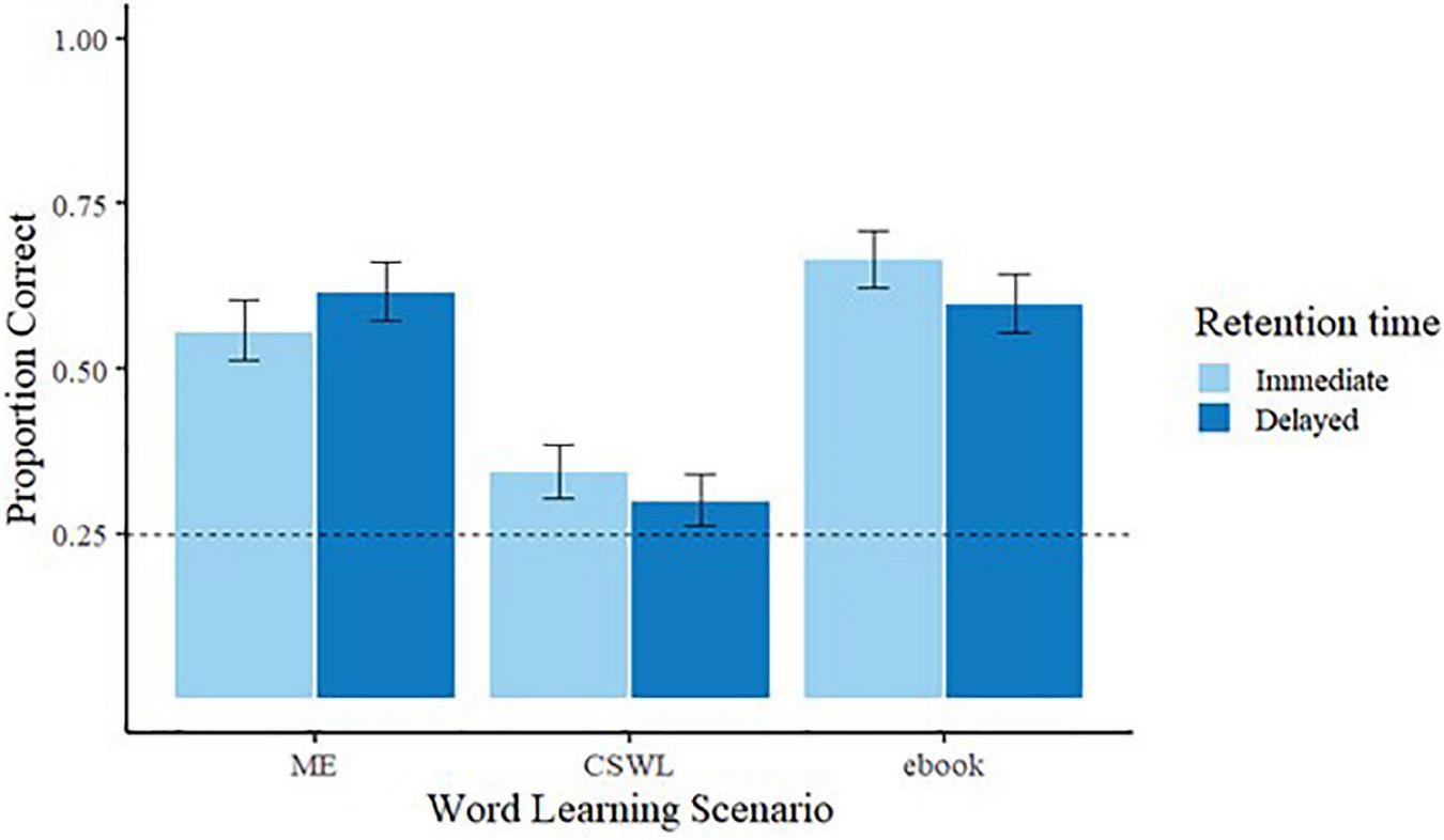 Children’s responses from the immediate and delayed retention tests were scored as correct (1) or incorrect (0) and proportions of correct responses were calculated for the analysis. A one-sample t-test on the accuracy of children’s responses averaged across all test trials was conducted for each of the word learning scenarios (i.e., ME, CSWL, and eBook) in each of the retention times (i.e., immediate and delayed). Children’s average performance was significantly above chance (0.25) for ME and eBook at both test times (immediate, ME M = 0.56 (SD = 0.26), t (14) = 4.63, p < 0.001, and eBook M = 0.66 (SD = 0.24), t (14) = 6.61, p < 0.001 and delayed, ME M = 0.62 (SD = 0.25), t (14) = 5.63, p < 0.001, eBook M = 0.60 (SD = 0.22), t (14) = 6.23, p < 0.001). In contrast, CSWL was nearly above chance for immediate M = 0.35 (SD = 0.23), t (16) = 1.70, p = 0.05 but not above chance for delayed retention, M = 0.30 (SD = 0.21), t (16) = 1.00, p = 0.17. A Bonferroni corrected alpha level (three comparisons) of 0.016 more clearly shows that CSWL cannot be regarded as different from chance for either immediate or delayed retention1 (see Figure 6 for a graphic representation of the immediate and delayed retention accuracy across word-learning scenarios).