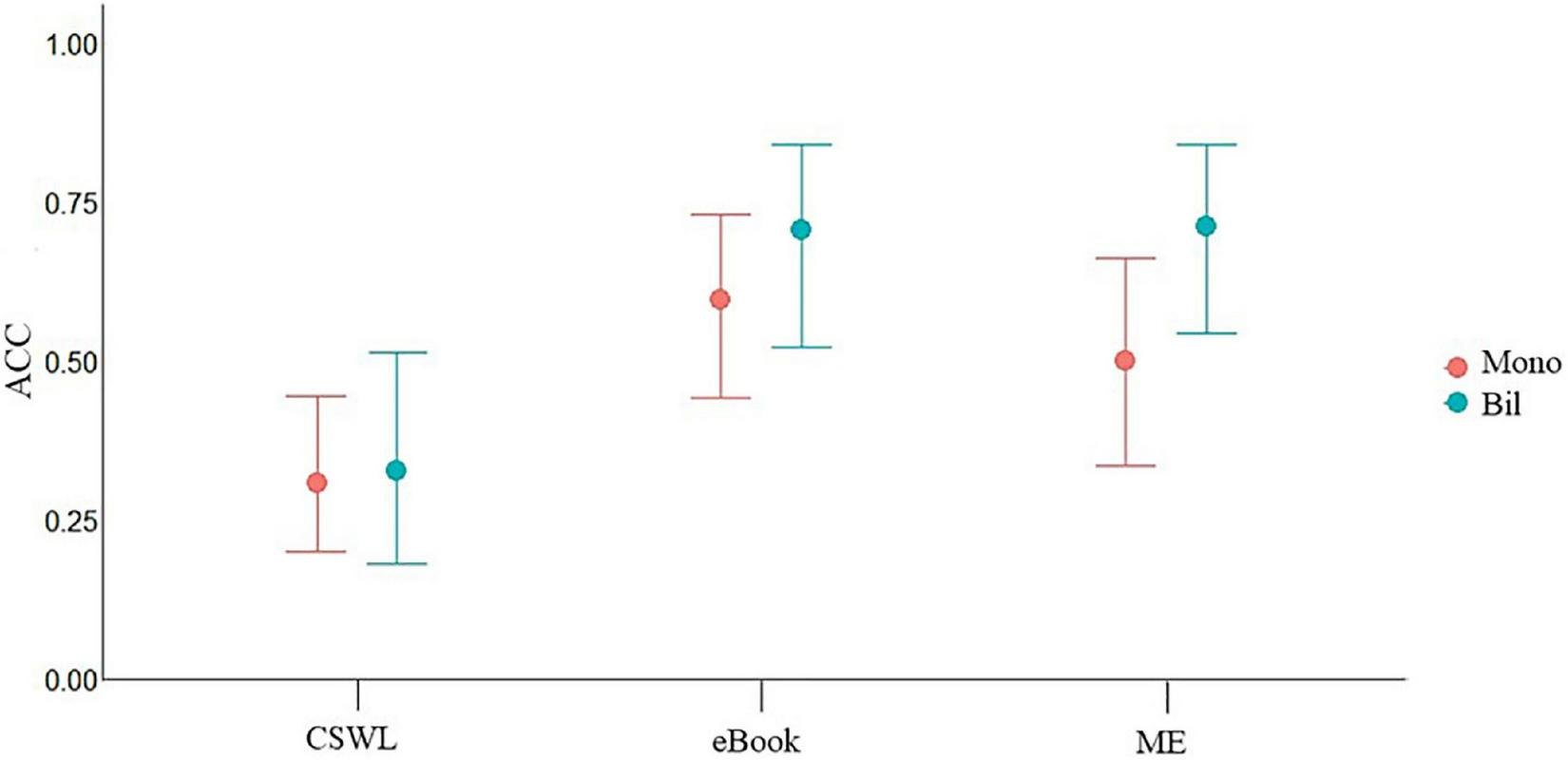 Visualization of “Condition*lgroup summed Model”. Lgroup_sum includes Mono, monolingual; Bil, bilingual; ACC, response accuracy.