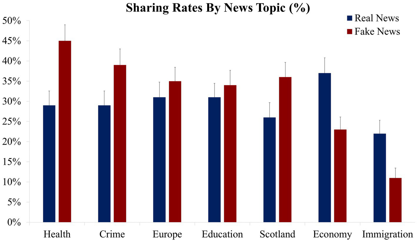 News sharing rates presented as a function of news topic and veracity. Mean percentage news sharing rates (the error bars denote the standard error of the mean).