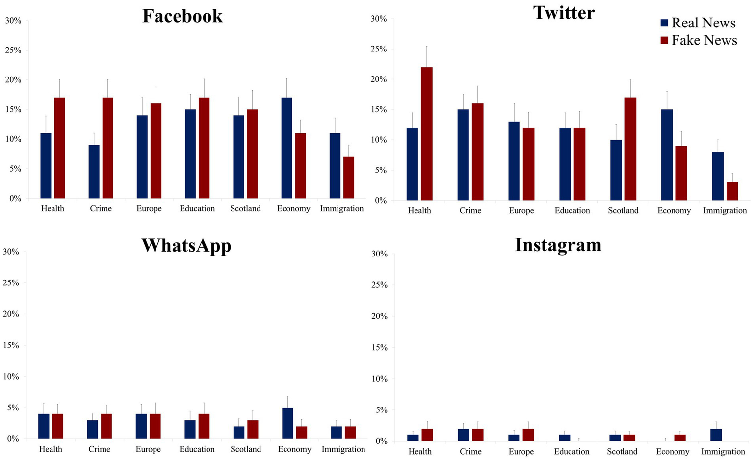 Taken together, the platform analysis findings provide important insights into sharing behavior. It is clear, that while WhatsApp and Instagram play an important role in the growing social networking landscape, there is still a preference for Facebook and Twitter when it comes to topical news information sharing. While a focus on Education and Europe and related news sharing was evident, this could be linked to the priorities of our left-of-center student sample and the study being conducted during heavy coverage of Brexit and what effect a ‘no deal’ with the EU could have on trade and the economy. However, Health related news dominated sharing behavior for Twitter and Facebook, albeit to a lesser extent for the latter, suggesting, in line with the preceding results that this topic, and these platforms, should be an important focus for targeting health misinformation going forward. Conversely, as noted for the previous analysis, immigration related fake news was shared infrequently across the platforms and this could indicate that those seeking to share disinformation about this topic may only find success among those with a doctrinal interest, in other words, the ‘best of intention’ users are not likely to share immigration related content.