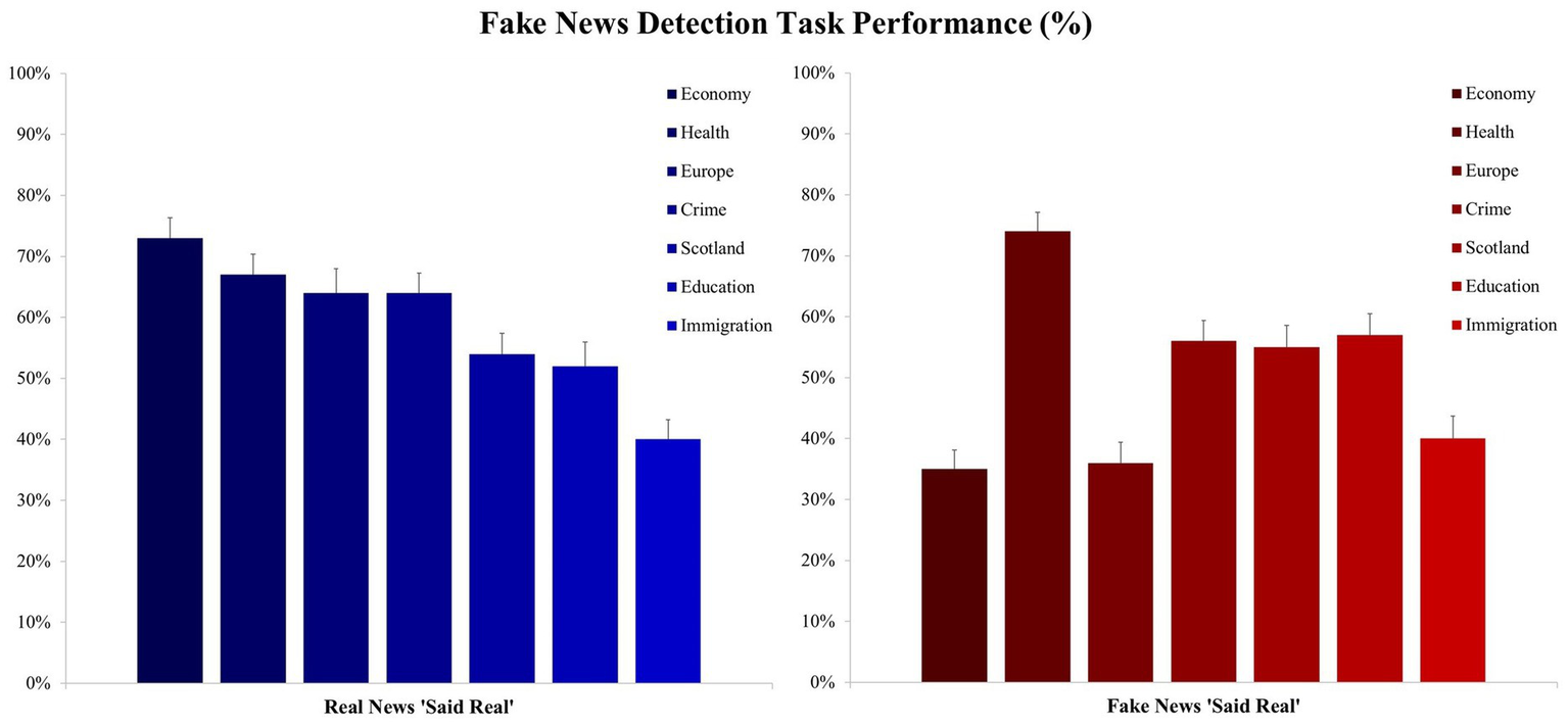 In the explicit fake news judgment task, we report considerable variation by topic domain and veracity. For real news detection, users scored above 50%, on average, for each of the topics except immigration. Given the left-of-center bias of our student sample, there may be relatively more reluctance to believe any type of news in relation to immigration, as it is normally only encountered within negative contexts in the media. For fake news detection, a clear effect shows that for fake health content, 74% of users, on average, misattributed these items as being real news. Again, as mentioned above, considering the pandemic, and the importance of effective health messaging, this data supports the notion that combatting health related misinformation is a necessary and pressing problem. Users were better at disregarding fake news related to Europe and the economy, and this is likely to be due to the focus on Brexit and its economic effects which were widely covered in the media during the study. Despite the nature of our sample (undergraduate political science students studying in Scotland), participants were poor at correctly labeling news related to Education, Scotland, and Crime, which suggests, for the first two topics, that closeness to the issues does not always inoculate against the acceptance of misinformation. Overall, in relation to the sample, we would expect the rate of misattribution of fake news as being real, to be greater in the wider population.