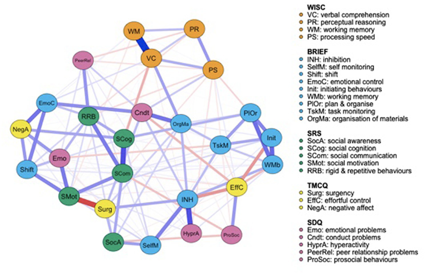 WISC, Wechsler intelligence scale for children; FSIQ, full scale IQ; VC, verbal comprehension; PR, perceptual reasoning; PS, processing speed; WM, working memory; SRS-2, social responsiveness scale; SCI, social communication and interaction; RRB, rigid and repetitive behaviors; SDQ, strengths and difficulties questionnaire; Emo, emotional difficulties; Cond, conduct problems; Peer Rel, peer relationship difficulties; HyperA, hyperactivity; ProSoc, prosocial behaviors; Int, initiating behaviors; Ext, externalizing behaviors; BRIEF-2, behavior rating inventory of executive functioning, second edition; Beh, behavioral difficulties; Emo, emotional difficulties: Cog, cognitive difficulties; TMCQ, temperament in middle children questionnaire; NA, negative affectivity; EC, effortful control; SU, surgency.