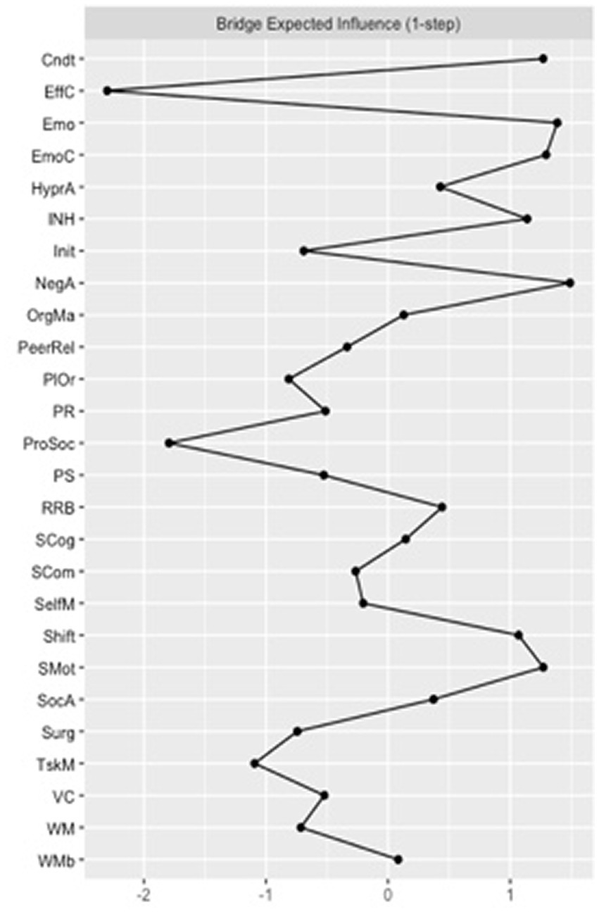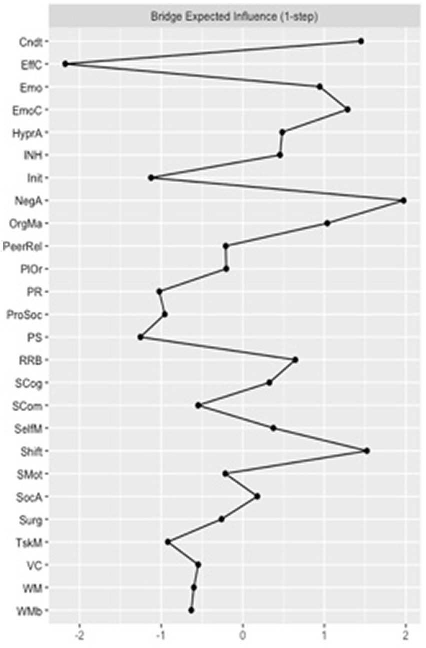 For both the FT and VPT group networks, the following measures were computed for each node: bridge closeness, referring to the average distance between one node and any other node that is part of another construct (i.e., questionnaire or assessment); bridge betweenness, referring to the number of times a node lies on the shortest path between two other nodes that are from different constructs; bridge expected influence (EI), referring to the sum of all the edges, either negative or positive, between each node and all other nodes from different constructs (Cramer et al., 2010; Epskamp et al., 2012; Eadeh et al., 2021; Jones et al., 2021).