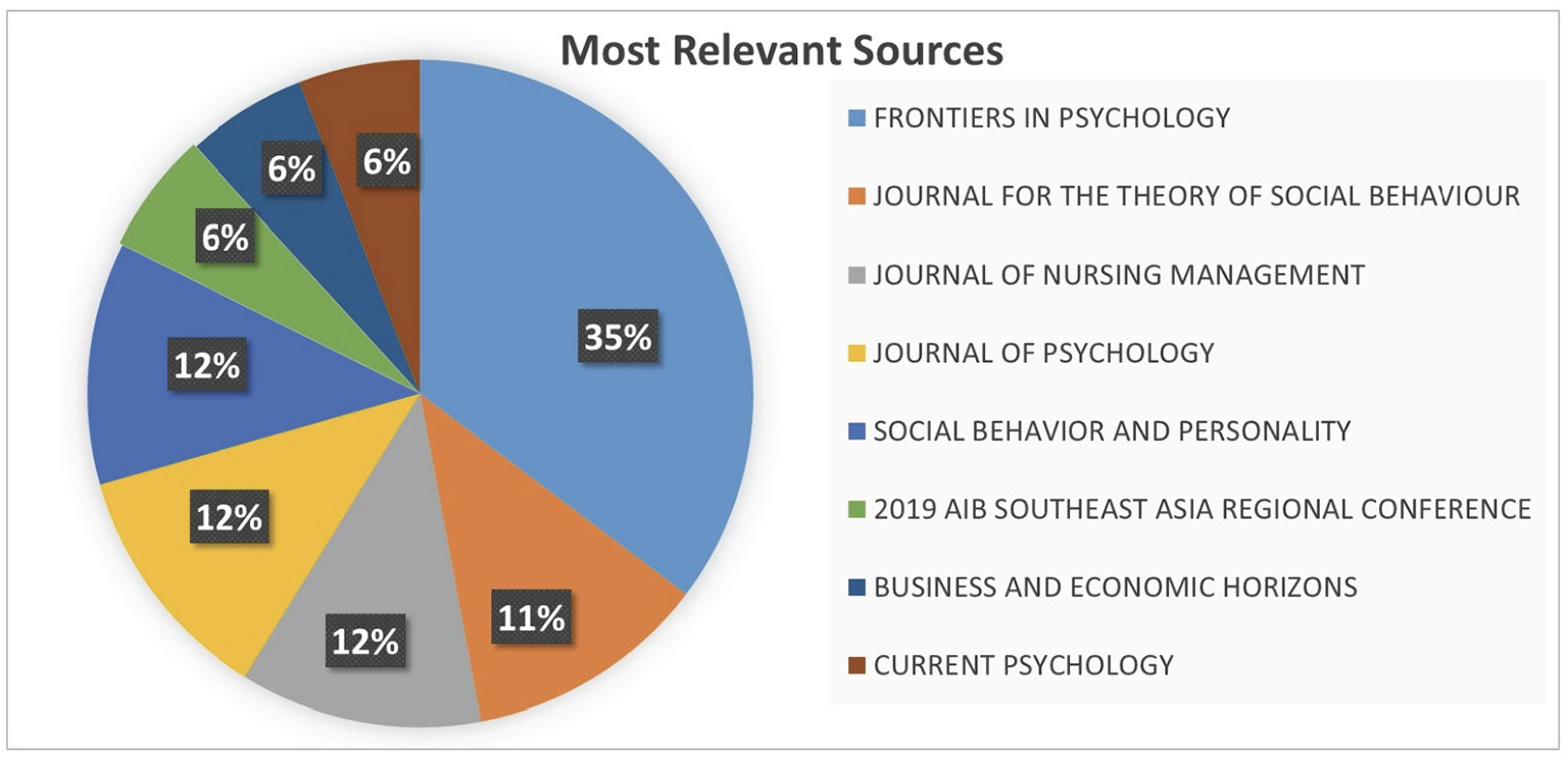 Further, as previously mentioned, many of the scientific publications on CCBs in the Web of Science index were published in Frontiers in Psychology (35%), followed by the Journal of Psychology (12%), Journal of Nursing Management (12%), and Social Behavior and Personality (12%). Considering the scientific journals above, both the publication of the articles in prestigious journals and the frequency of publication show that the concept of CCBs is topical and relevant.