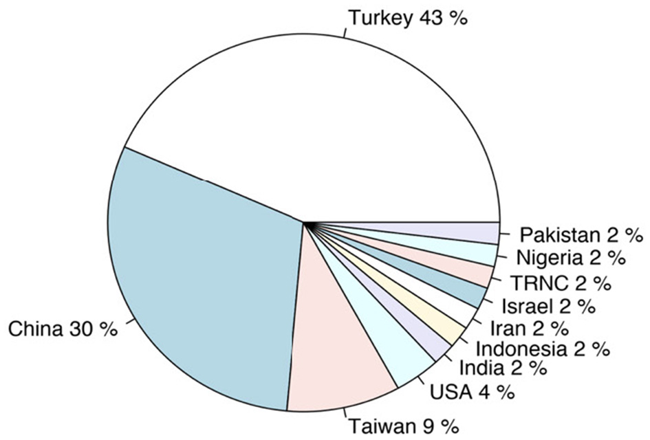 Distribution of the publications by countries.