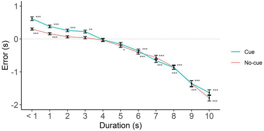 Figure 3. Directional error (target interval—response) as a function of cue and interval duration. One-sample two-tailed t-test analyses started at < 1 s intervals and proceeded until we had the first significant deviation from zero. Positive, negative and zero values indicate overestimation, underestimation, and no error, respectively. *p < 0.05; **p < 0.01; ***p < 0.001.