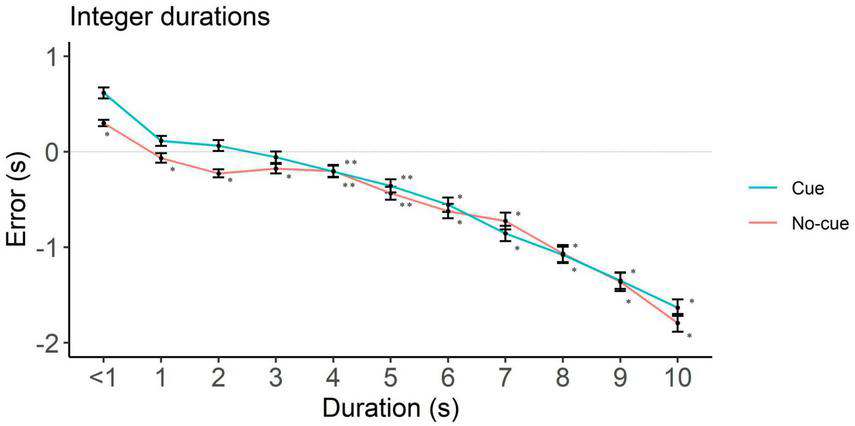 Figure 4. Directional error (target interval—response) as a function of cue and duration for integer durations only. One-sample two-tailed t-test analyses started at < 1 s durations and proceeded until we had the first significant underestimation. Positive, negative and zero values indicate overestimation, underestimation and no error, respectively. *p < 0.001, **p < 0.05.