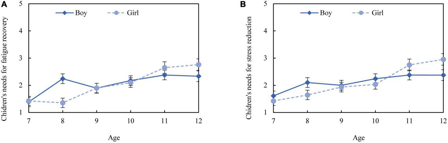 The non-parametric tests were conducted to examine the influence of age and gender on children’s need for restoration. The results showed a significant difference in both stress reduction and fatigue recovery between age groups (p < 0.001), but there was no substantial difference between the genders (p > 0.05). As shown in Figure 5, children’s need for stress reduction and fatigue recovery gradually increased with age. Moreover, boys’ need for restoration was higher than girls’ before 9 years of age, while girls reported more restoration needs than boys after 10 years of age.