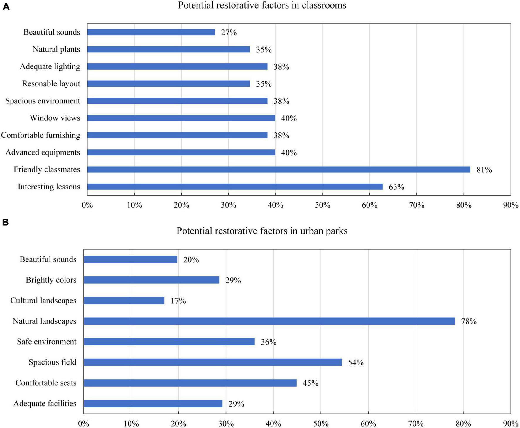 The potential restorative factors in classrooms (A) and urban parks (B).
