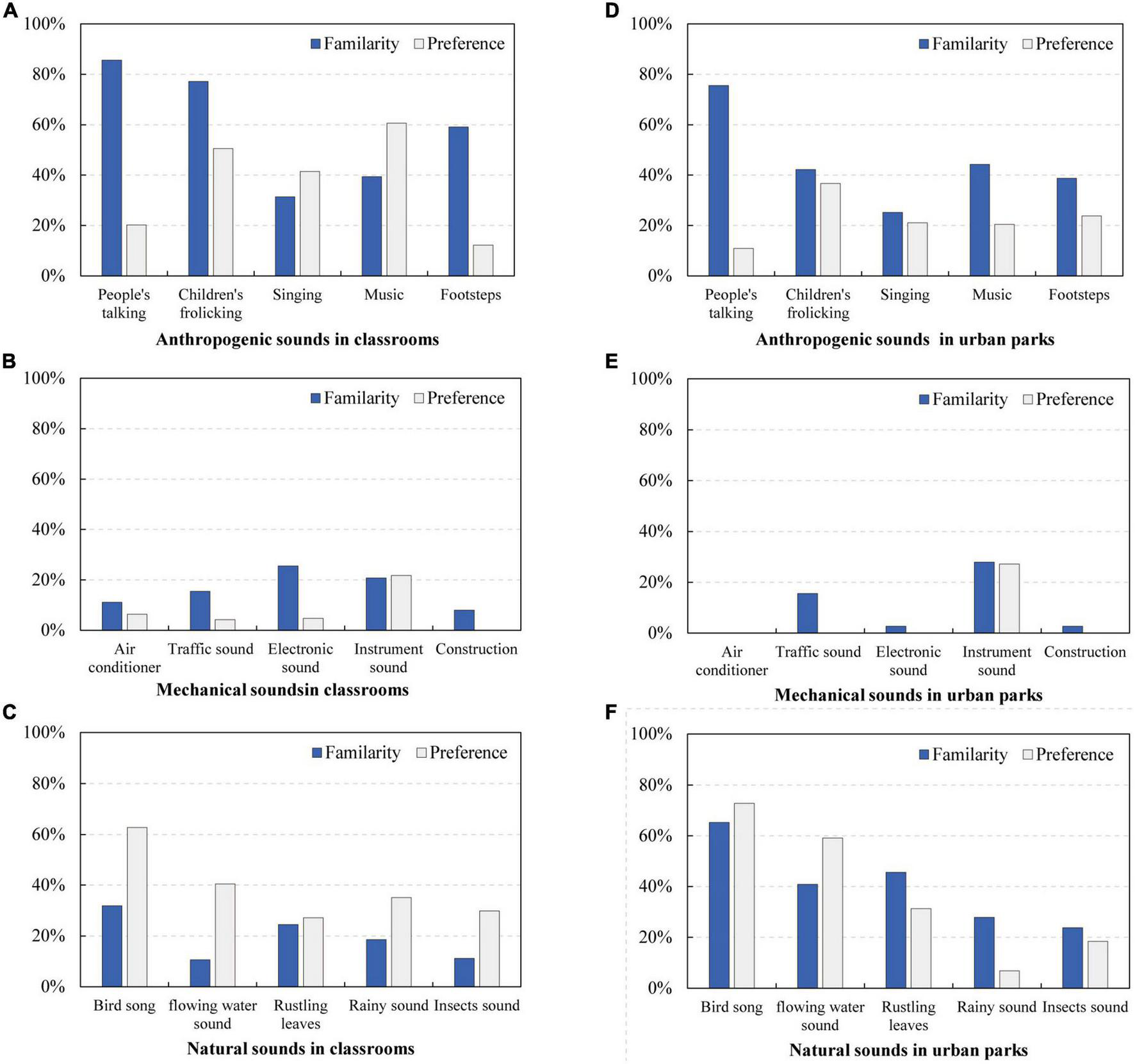 In the setting of urban parks, the most familiar sound sources for children were anthropogenic sounds (i.e., talking, music, and children’s frolicking) and natural sounds (i.e., birdsong, rustling leaves, and flowing water). However, natural sounds seemed to be preferred by children over anthropogenic sounds. For example, birdsong and water sounds were preferred by 73 and 59% of children, respectively (refer to Figure 9F). However, all anthropogenic sounds were preferred by less than 40% of children (refer to Figure 9D). Additionally, mechanical sounds were the least familiar and preferred sounds for children in urban parks, and this result was similar to that of classrooms (refer to Figure 9E).