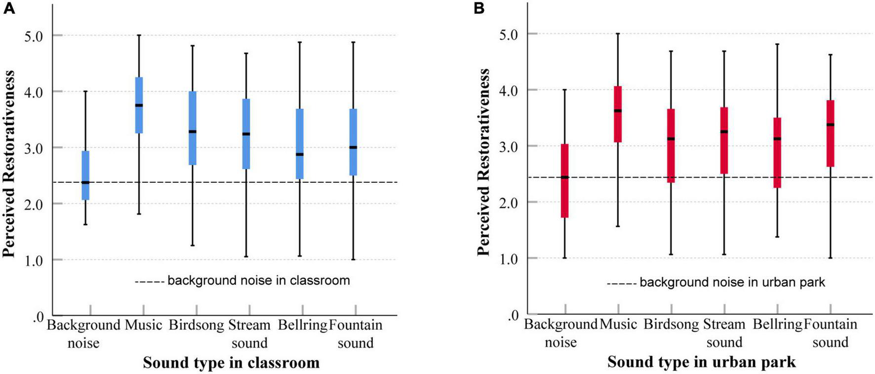 Recently, the restorative benefits of soundscapes for children have been demonstrated in a few studies. For example, an experiment of subjective evaluation conducted in a simulated classroom and urban park found that the restorative qualities of environmental sounds perceived by children were attractiveness, compatibility, and coherence (Shu and Ma, 2018). Moreover, empirical research has indicated that classroom soundscapes could provide significant restorative benefits to children’s reaction time and short-term memory (Shu and Ma, 2019), while urban park soundscapes can facilitate psychophysiological recovery among children to a certain extent (Shu and Ma, 2020). Nevertheless, research on the role of everyday soundscapes in children’s restorative experiences is insufficient. When introducing pleasant sounds into noisy environments to improve soundscape quality, both sound type and sound level have long been viewed as significant indicators of a desirable soundscape (Zhang et al., 2019a). However, existing literature has mainly focused on the impact of sound types, whereas few studies have examined the impact of sound levels. Additionally, whether children’s perceived restorativeness differs when applying restorative sounds in different visual contexts remains uncertain.