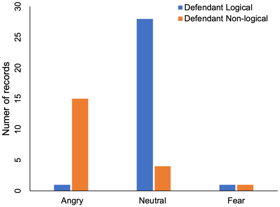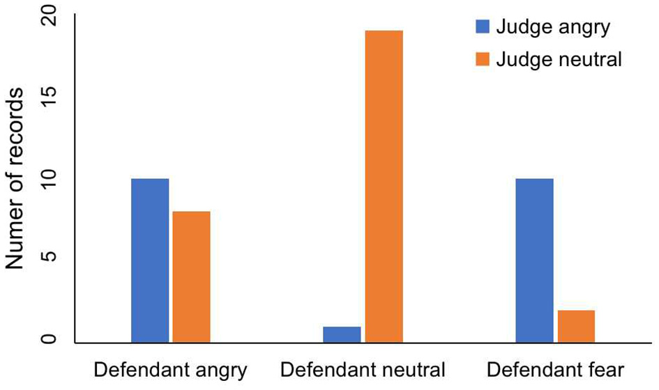 The emotions are divided into three categories: anger, neutrality and fear. The judge's tone has two emotions. One is angry and the other is neutral. In Table 1 and Figure 2, we can see the judge's emotion and the defendant's emotion. Ten records show that the judge was angry and the defendant was afraid. Nineteen records show that the defendant was neutral while the judge remained neutral. However, only one record shows that the defendant was in a neutral state when the judge was angry. This result suggests that the judge's anger may make the defendant be not netral. Regardless of whether the judge was angry or neutral, the numbers of records in which defendant is angry are ten and eight. This shows that the defendant's anger has nothing to do with the judge's emotion.
