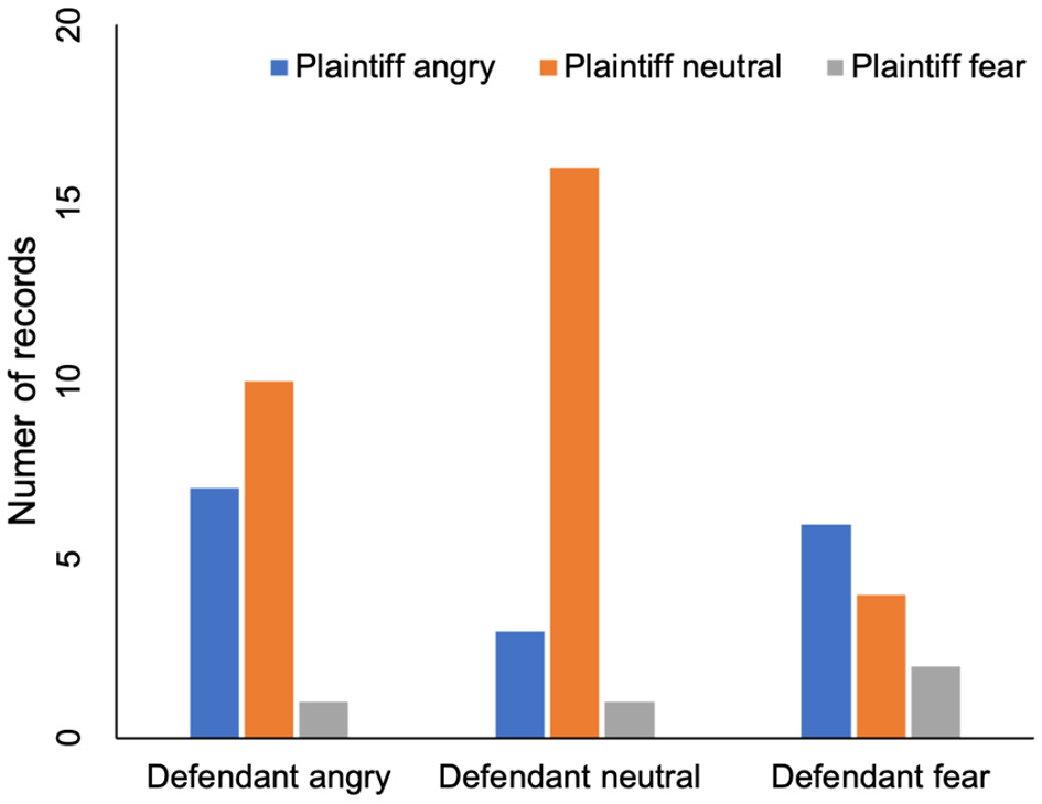 In addition, this paper also analyzes the role of the plaintiff's voice in the trial. Again, we need to understand the plaintiff's and defendant's emotions first. The plaintiff's voice was divided into three categories: angry, neutral and fearful. The plaintiff's emotion and the defendant's emotion are shown in Table 2 and Figure 3. In six cases, when the plaintiff was angry, the defendant was afraid. On four records, the defendants were frightened by the plaintiff's neutrality.This indicates that defendant's fear emotion may not be affected by the plaintiff's emotion. Table 2 also shows that the number of records ,in which defendant is angry when plaintiff is angry or neutral, are seven and ten, respectively. There is no significant difference, which indicates that defendant's angry emotion is not affected by plaintiff's emotion either.