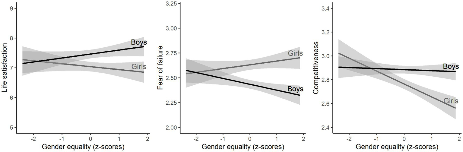 From a practical point of view, our findings describe both a problem and a potential solution. The problem is that girls’ life satisfaction is especially low in gender-equal societies. The potential solution is that interventions that target girls’ low competitiveness and high fear of failure in these societies could also be a way of achieving greater life satisfaction. How to conduct such interventions is beyond the scope of this study. The literature on interventions includes studies on both competitiveness (Boneva et al., 2022) and fear of failure (Stamps, 1973; Martin and Marsh, 2003), which may be a starting point.